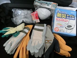 内海舞さんは、必要な人に貸すことも考えて、余分に防災グッズをそろえています。とくにグローブは、ゴム手袋・革の手袋・作業用軍手を全部で6セット用意!そのほか、頭と足を守るヘルメットと登山靴、呼吸器と目を守る防塵マスクとゴーグル、防災トイレ、衛生用品、生理用品、女性用品と、さまざまなケースを想定したグッズを揃えています。