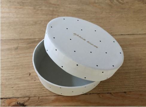 「この箱について語らせたら一晩かかっても、話しつくせないです。」と星谷さん。繊細なお菓子のボンボニエールを入れるこの箱は、すっぽり手に収まる可愛らしい楕円形。専用の木型をわざわざ作らなければならないほど、この楕円の形を作るのは難しい。ドットの柄を綺麗に出すにも難しく、職人さんがひとつひとつ手貼りで作り上げているというこだわりの箱です。「たまごをあためるように大切に使ってほしい」という想いから絶対に楕円の形をあきらめられず、こだわりぬいてこの箱を作った星谷さん。お菓子を食べ終わったあとも、大切なものを入れる箱として使い続けたくなりますね。