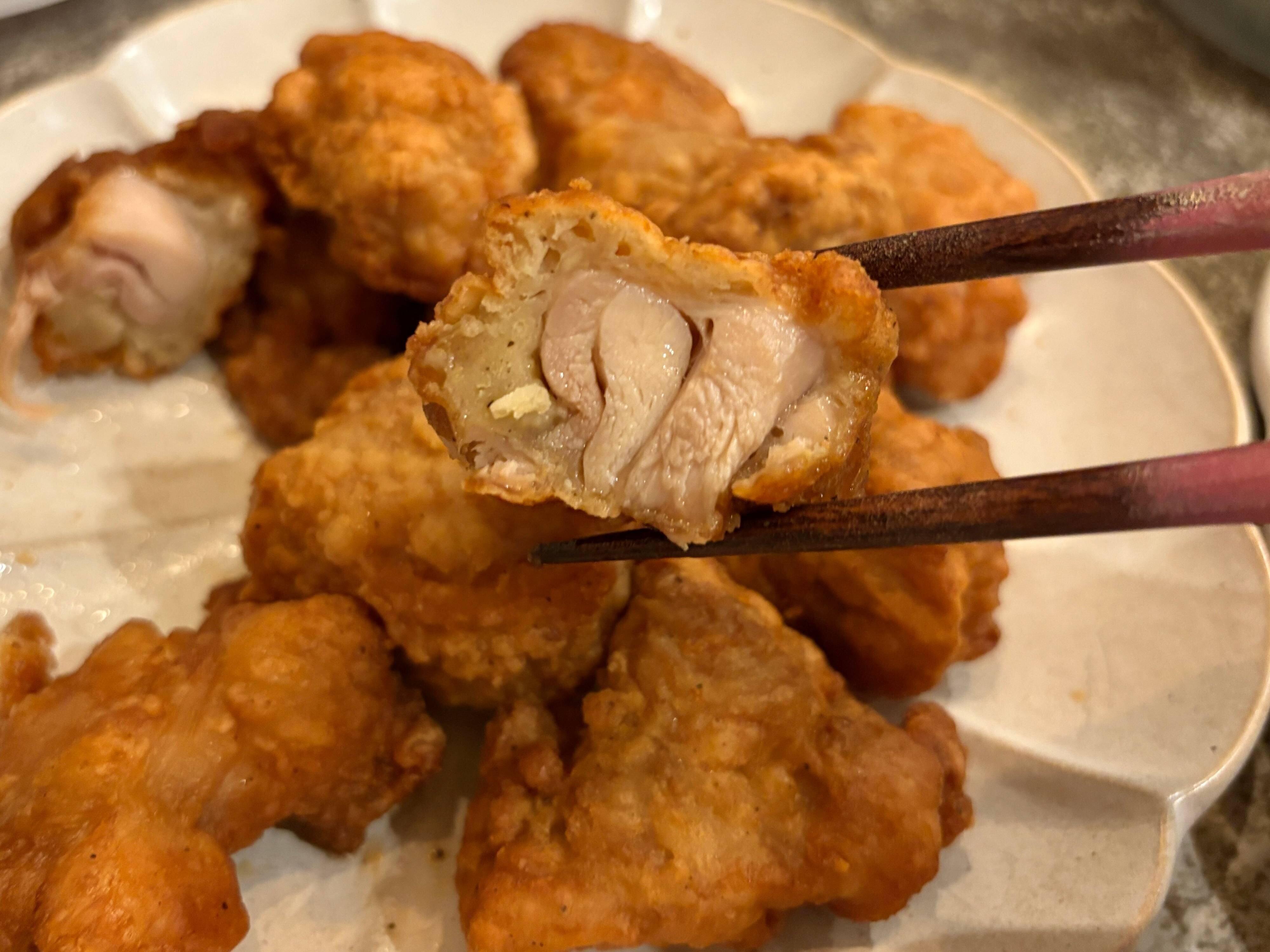 加熱後のからあげは、冷凍とは思えないほど柔らかくてジューシー!衣のサクサク感は控えめですが、レンジ加熱後にオーブントースターで加熱すると表面がカリッと仕上がりますよ。