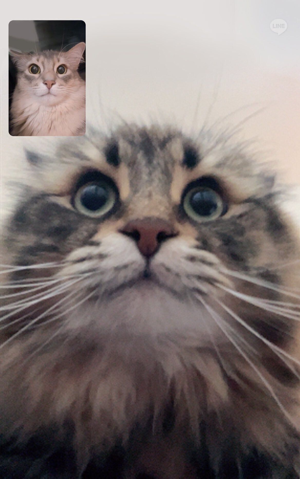 「友達の猫を数日預かることになったのでテレビ電話でお世話の内容を確認していたところ、お互いの猫が画面に映り込んできて、気づけば猫のリモート会議のようになっていました」