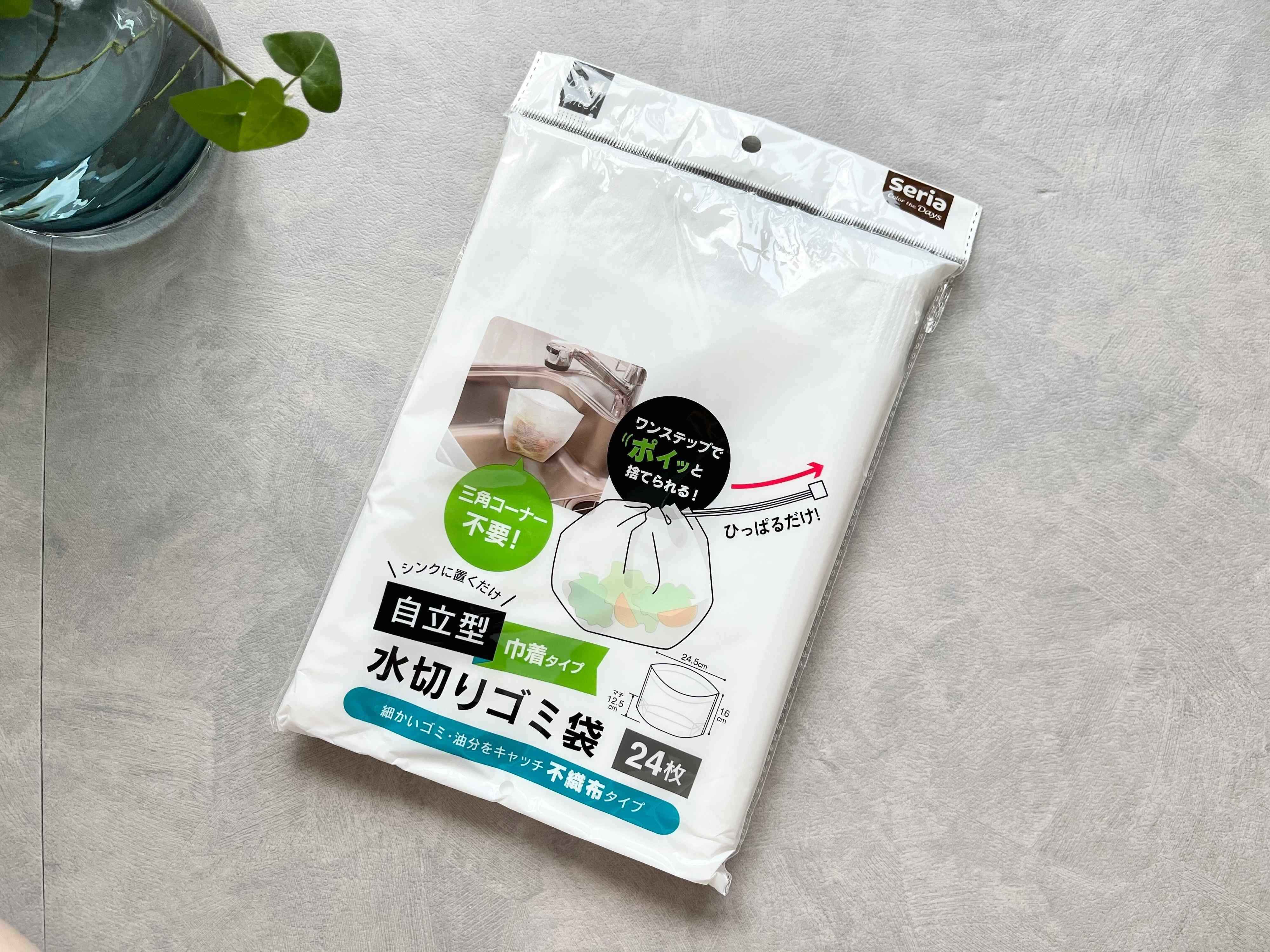 セリアの「自立型不織布水切りゴミ袋 巾着タイプ」は、三角コーナーを使いたいけど掃除や置き場所に困っている方には、まさに最適の便利グッズです。