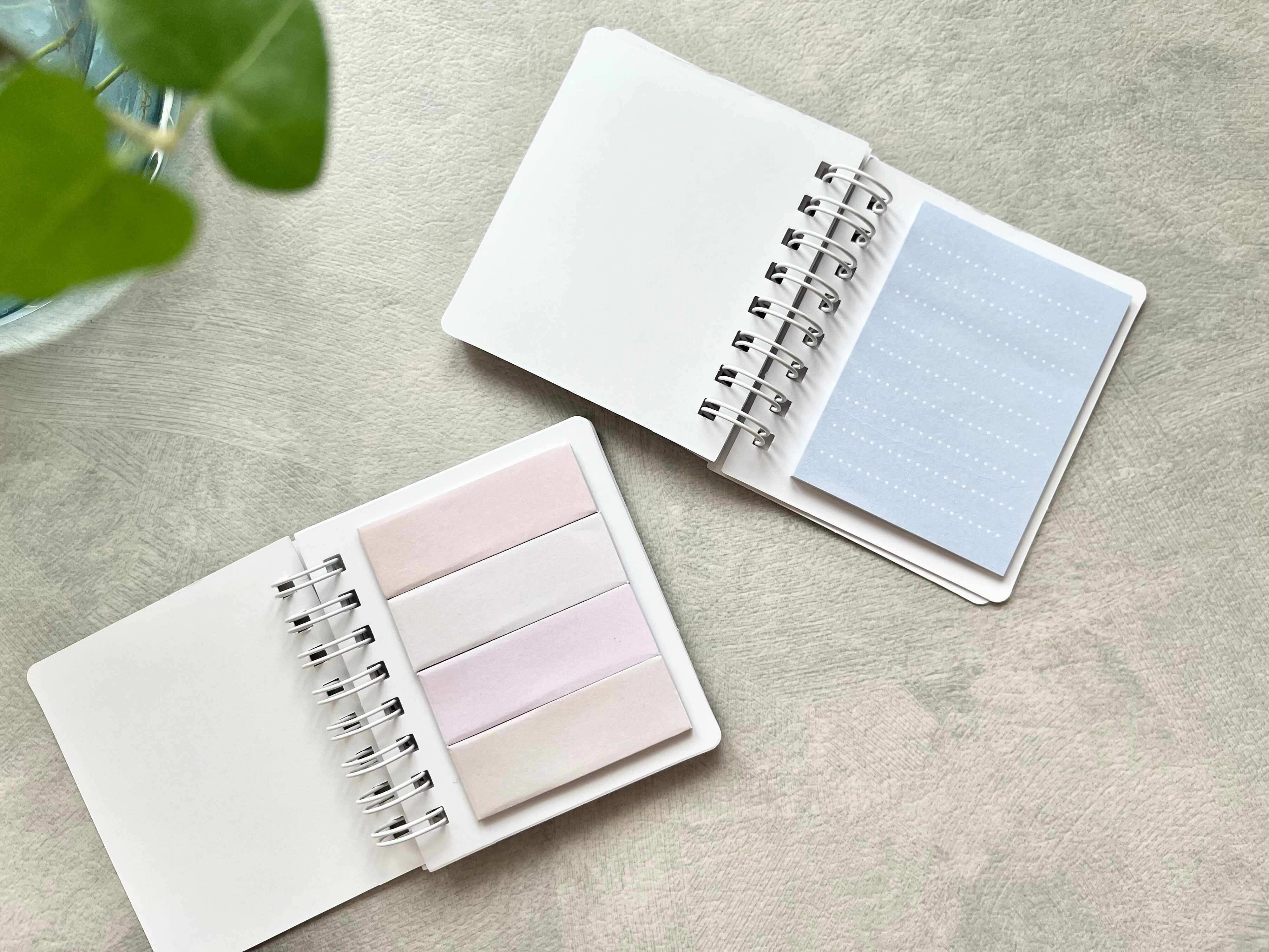 右側が寒色系のカラーのふせんが入った「ステラブルー」で、左側が暖色系カラーのふせんが入った「ブルーミングピンク」という商品。