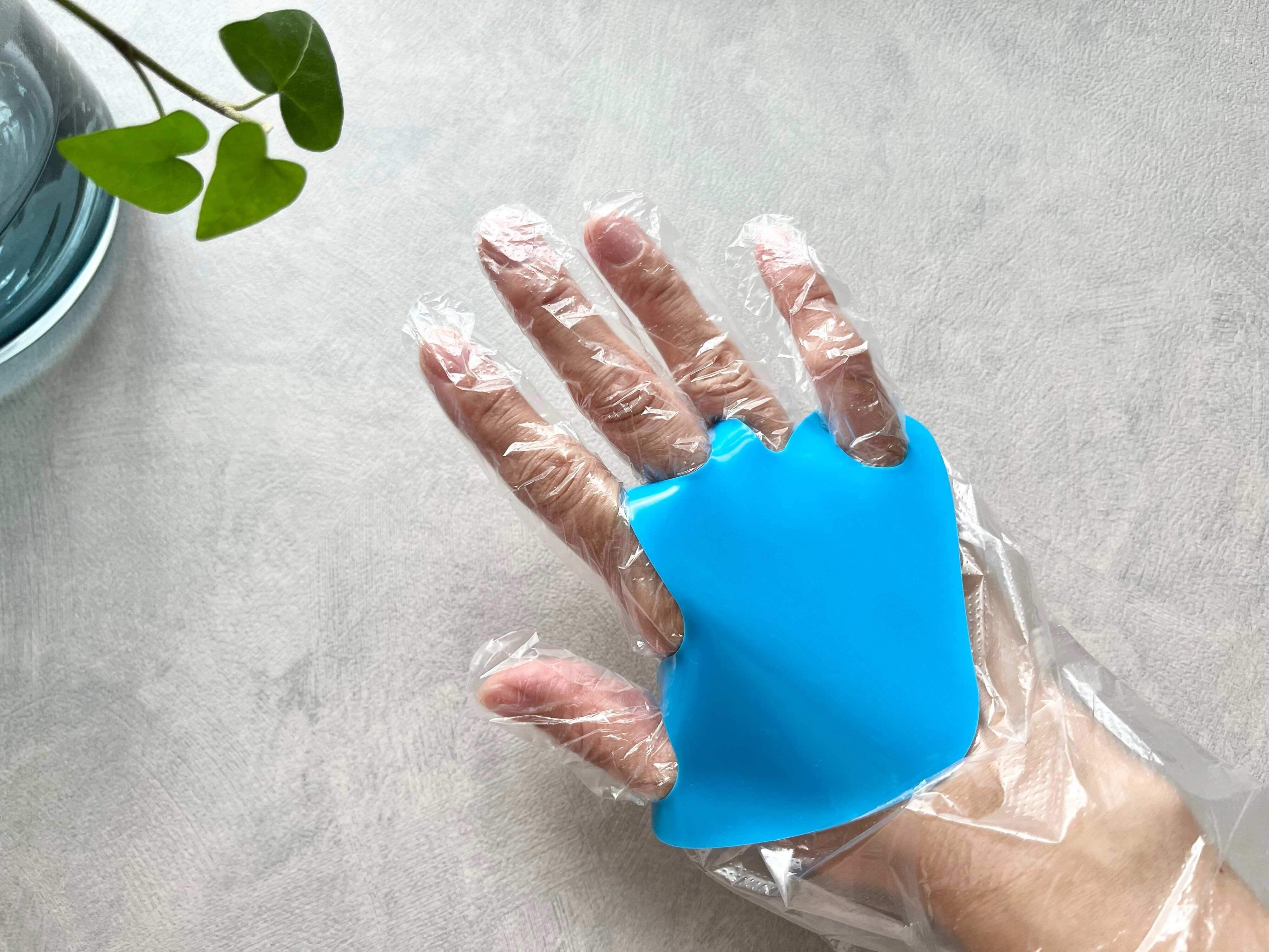 使い方は、初めて使う時だけ透明シートを剥がして中性洗剤などで洗います。あとはビニール手袋つけてから、手の甲の上にくるように、親指と中指と小指を商品の3つの穴にそれぞれ通して取り付けるだけでOK!