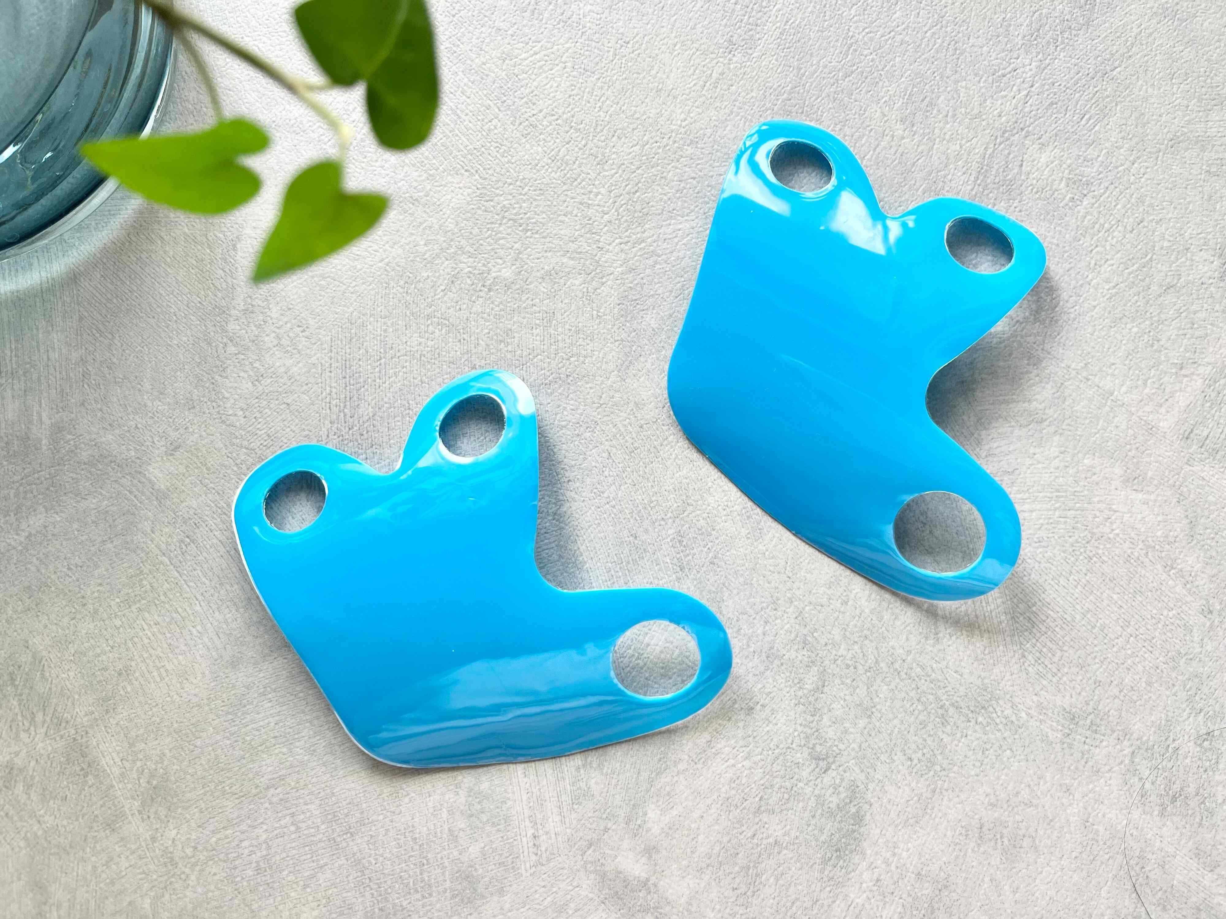 こちらの商品は左右兼用の2枚入りで、価格は110円で販売されています。素材にはシリコーンゴムを使用しており、見た目は穴が3つ開いた、少し変わったデザインをしています。
