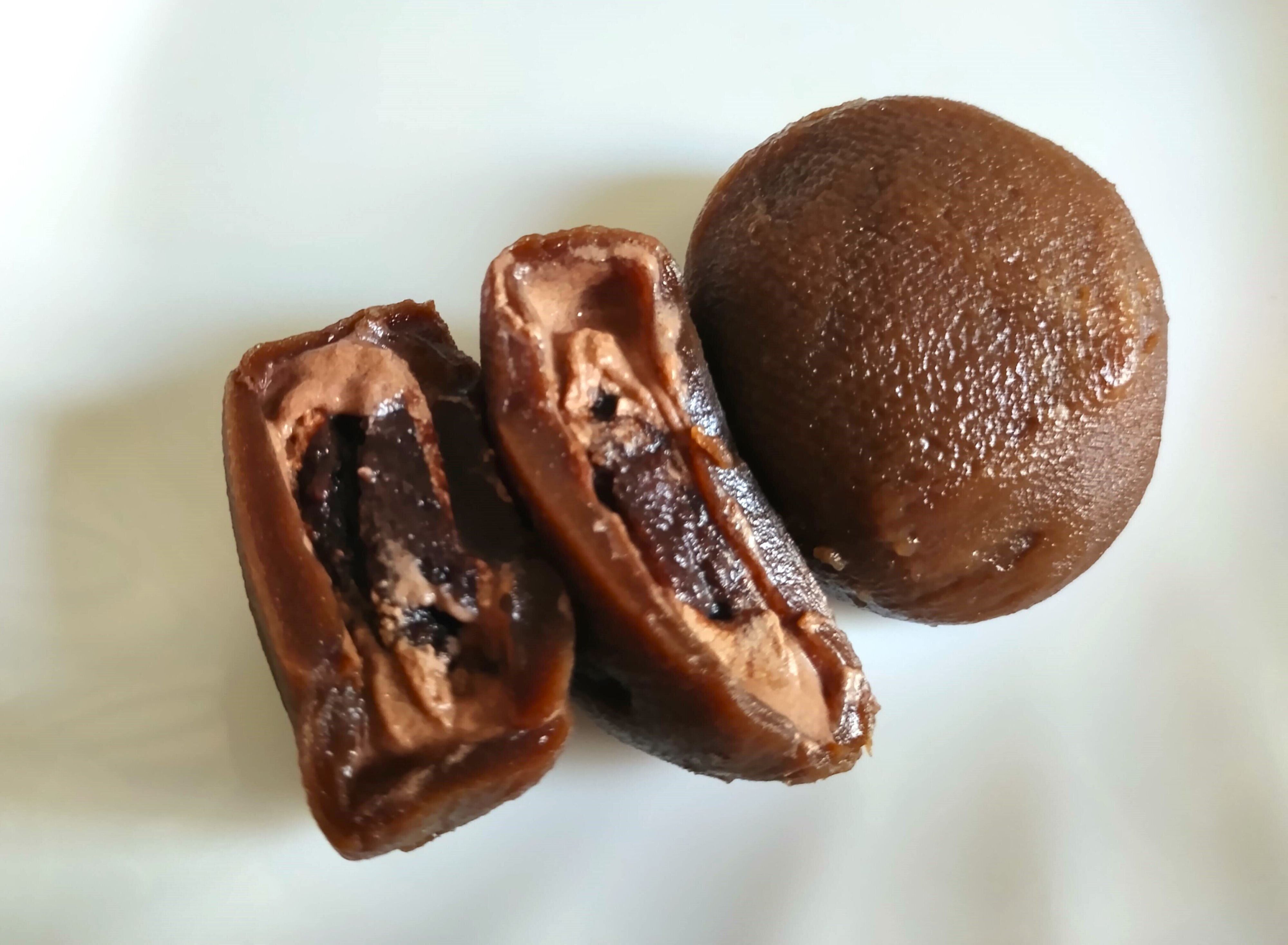 もっちりチョコレート味の生地の中にチョコホイップ、その中央にチョコレートソースが入ってまさにチョコレート三昧なホイップクリーム大福です。