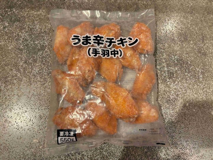 続いてご紹介する「うま辛チキン(手羽中) 970円」は、某ファミレスの人気メニューにそっくりと話題の商品です。1袋550g入りで、私が購入したものには15個のチキンが入っていました。