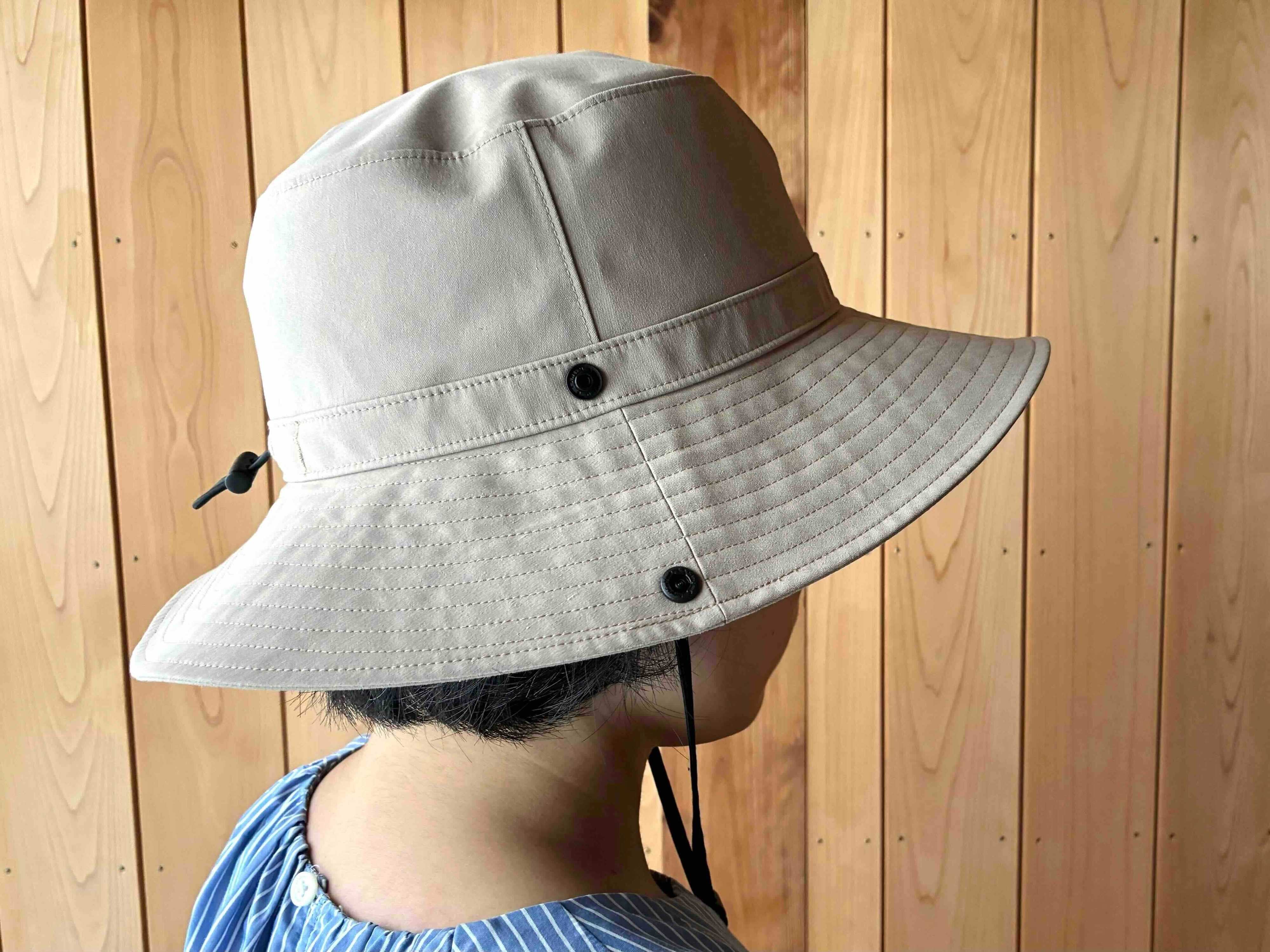 このハットの魅力は、天候を気にせず使える万能さ。UVカット率90%以上の生地を使用し、つばは7.5cmとやや広め。顔に影を作ってくれるので、日焼け対策に効果的です。