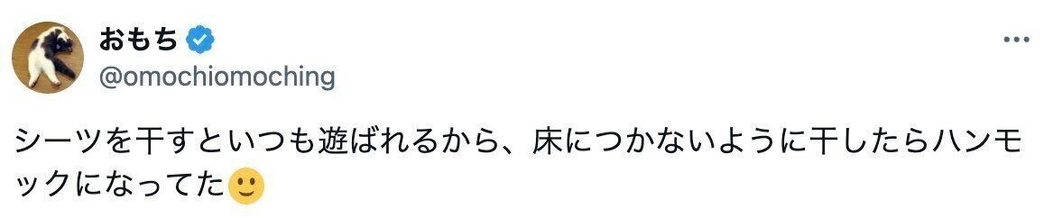 おもちさん(@omochiomoching)の投稿がXで話題になっています。投稿したのは、干しておいたシーツをハンモックのように使ってくつろぐ、愛猫おもちちゃんの動画。投稿には5.1万件のいいねと「かわいい」の声が集まり、話題になりました。
