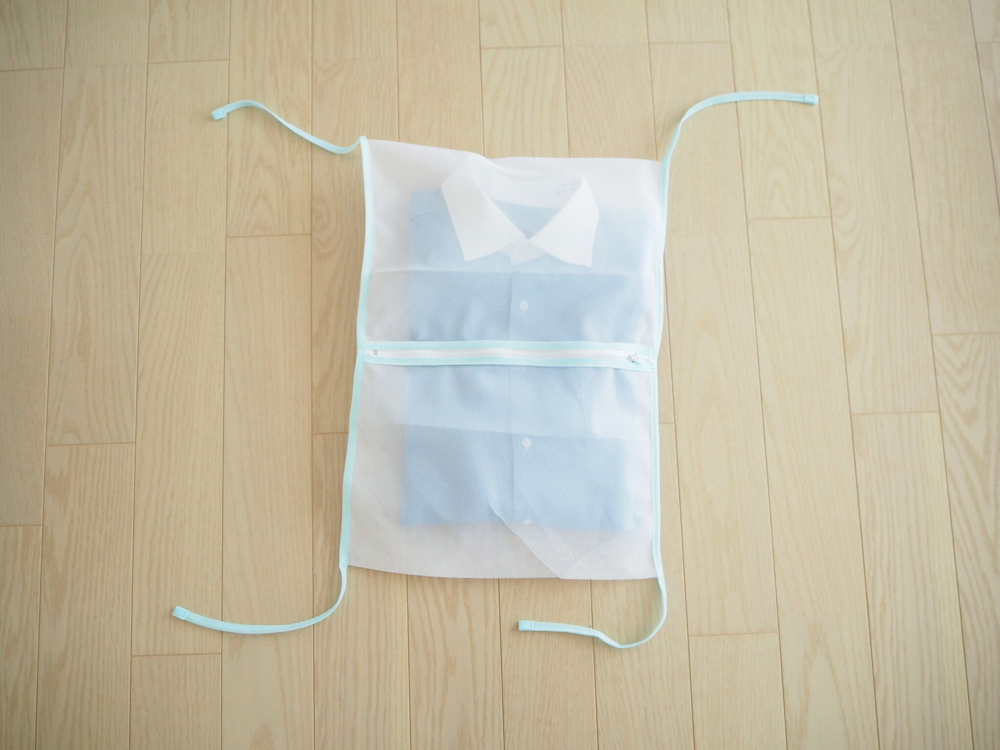 着用後のワイシャツは軽くたたんでネットに入れ、付属のひもで結べばコンパクトにしまえます。