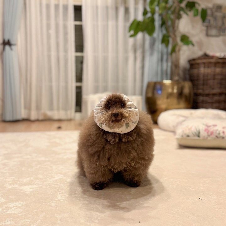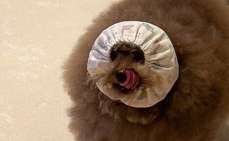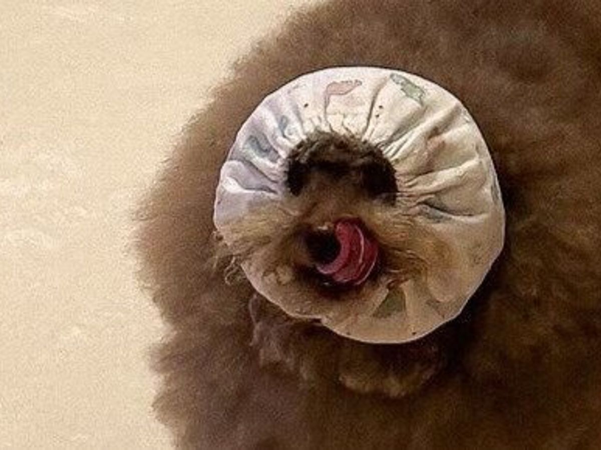 ごつもりプードルさん(@__mohu_c)が投稿したのは、愛犬チロルちゃんの、ご飯時の可愛らしい姿。普段は全身モコモコなイメージのチロルちゃんですが、スヌードを付けるといつもとは違った顔になるそうです。「可愛い」と驚きの声が集まりました。