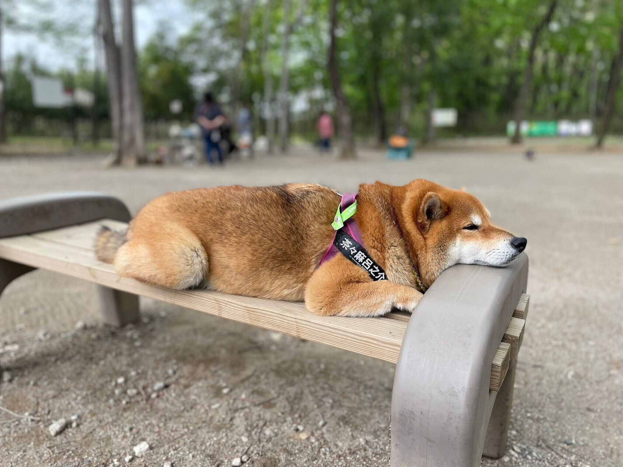 「こちらのドッグランは、パピーのころから通っているランで、昔はアクティブに動いていたのですが、最近はなかなか遊ばなくなりました。たまにスイッチが入って走ることもありますが、90%はベンチで寝ています。ちなみに、ベンチが好きでいろいろな場所でベンチに乗りたがるので、ほかのドッグランに行ってもこんな感じです。理由は、ただ単に遊びたくない、興味がない、ベンチで寝るのが気持ちいいって感じなのかと思います」