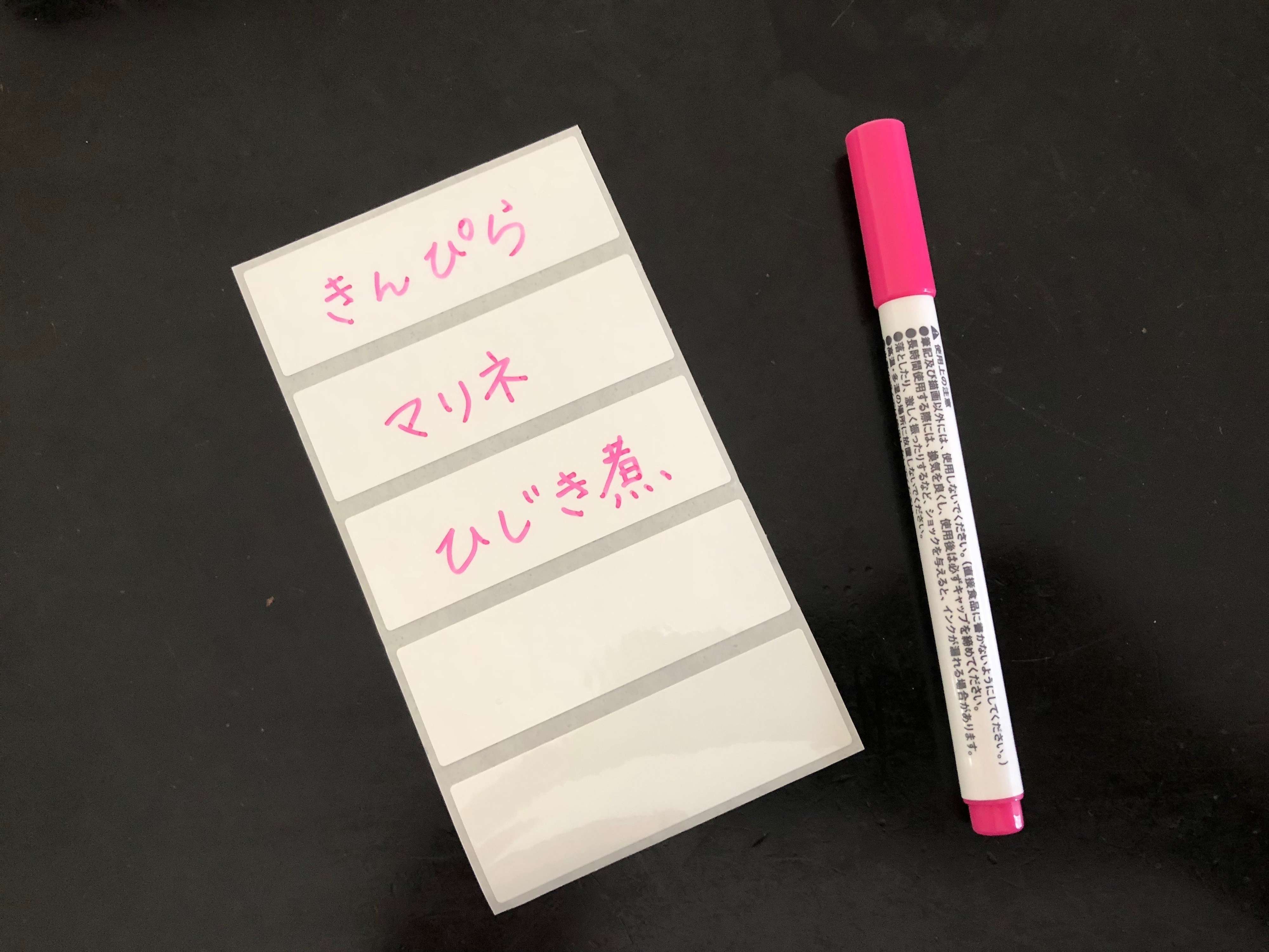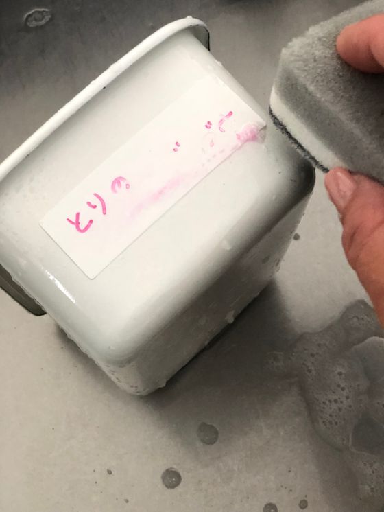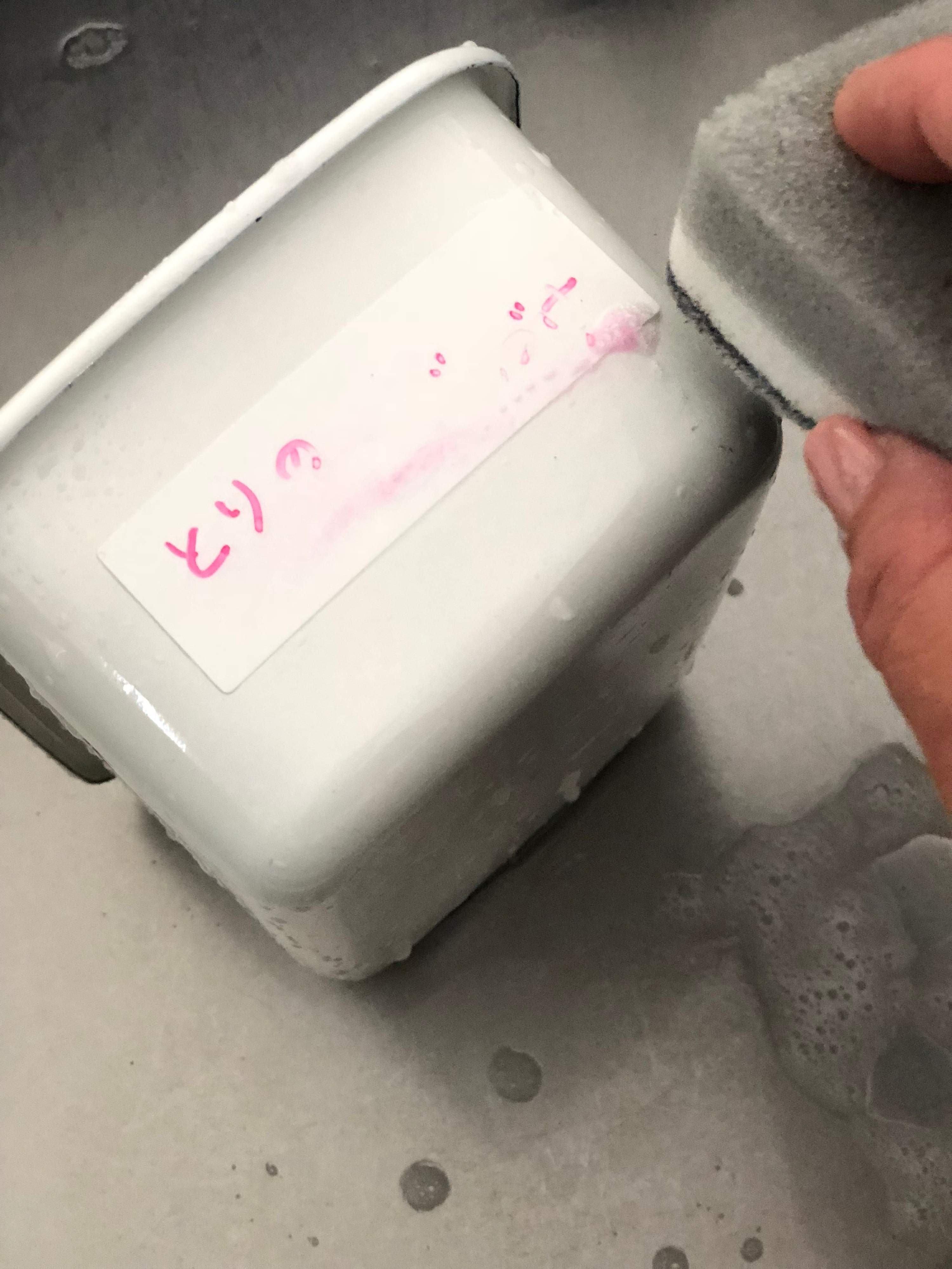 作り置きおかずを入れるホーロー容器にもピッタリのこのラベル。水には強い反面お湯と中性洗剤を使えばスルッと簡単に落ちちゃいます。強い水流でも落ちません。