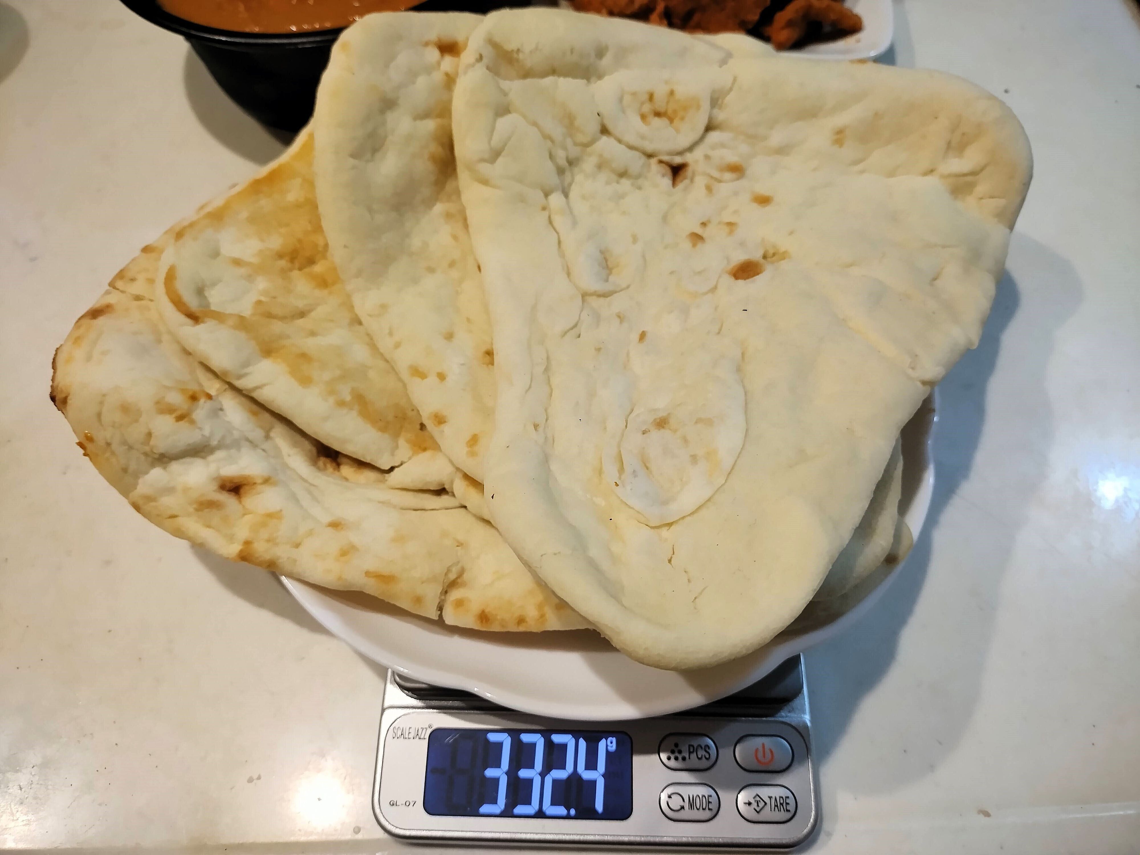 チキンの下には小ぶりなナンが4枚入っています。ナンは4枚入っているのですが、カレーを4人で分けるとちょっと少な目かなという印象です。だいたい2~3人前くらいではないかと思います。