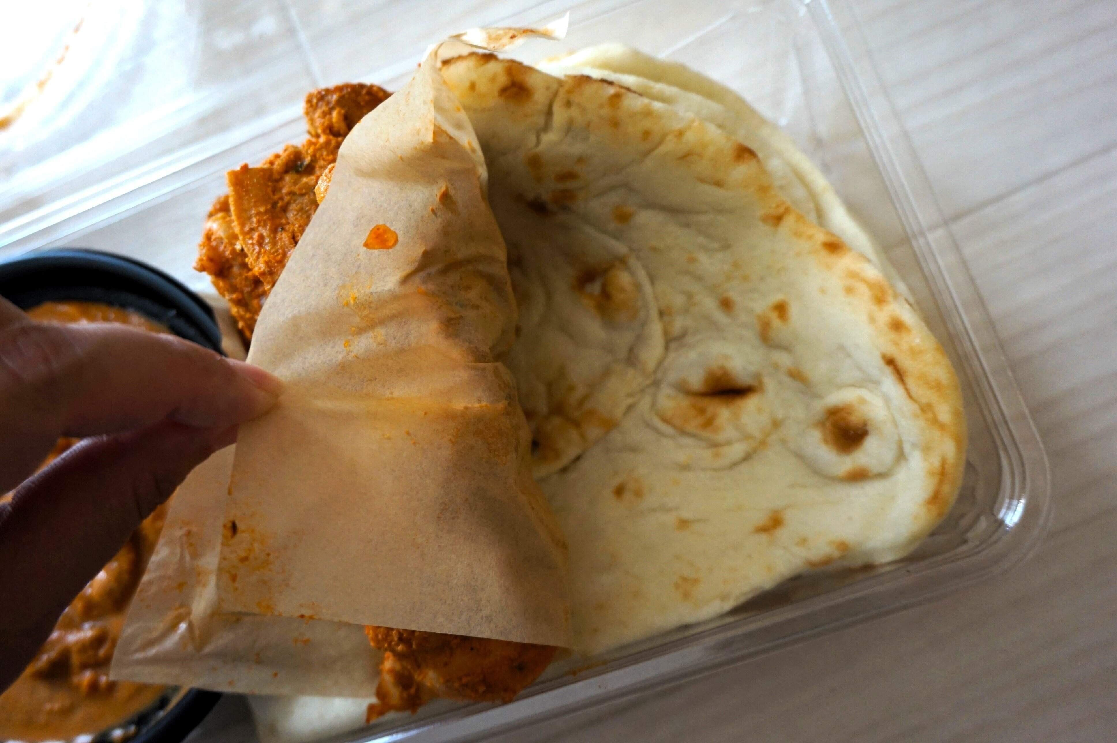 パサつきが気になったので、ナンを1枚だけ電子レンジで軽く温めてみたのですが、そのほうがふんわりして食べやすくなりました。筆者はナン1枚あたり500Wで15秒くらい温めたのですが、温めすぎると逆に硬くなってしまいそうですので、必ず様子を見ながら温めるようにしてください。