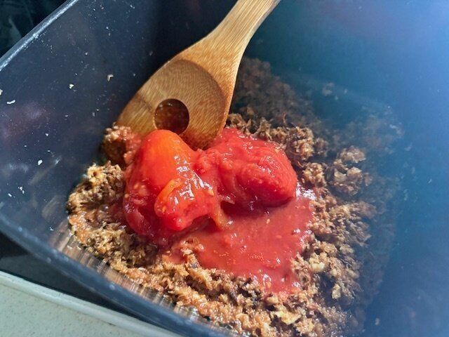 作り方は簡単!みじん切りに切った玉ねぎを炒め、しんなりしてきたらにんにく、しょうがを加えてさらに炒め、ホールトマト缶を加える。