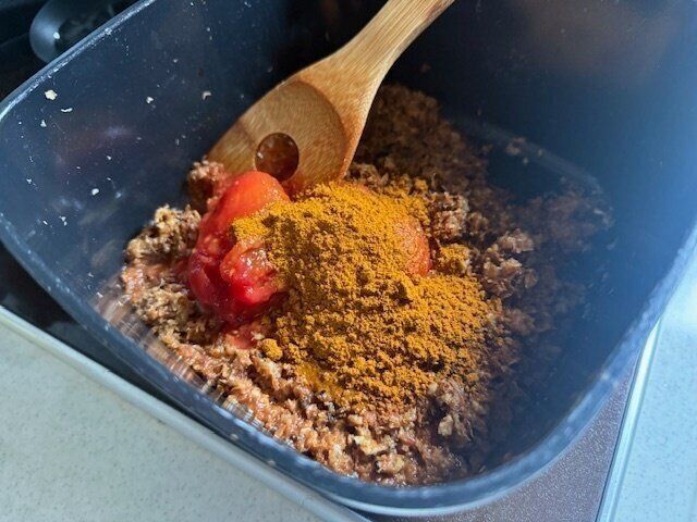 そこへスパイスミックスを加えて、さらに炒めます。スパイスミックスは袋を空けた瞬間から