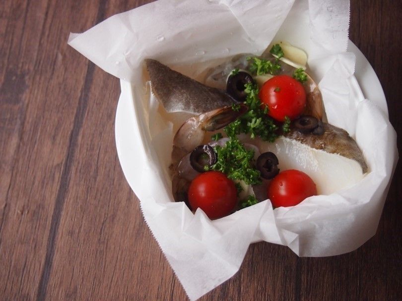 そこに鱈、海老、ミニトマト、オリーブ、パセリ、ニンニク、料理酒、塩を入れて、レンジで5分加熱。