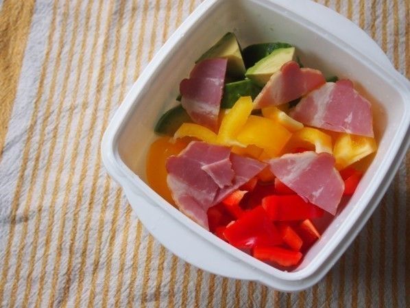 蒸し器に、切ったアボカド、パプリカ、ベーコンを入れて、レンジで3分加熱。