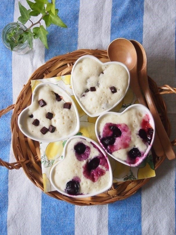 ホットケーキミックスで作った、蒸しパンの生地を器に流しいれたら、蒸し器に入れてレンジで1分半。