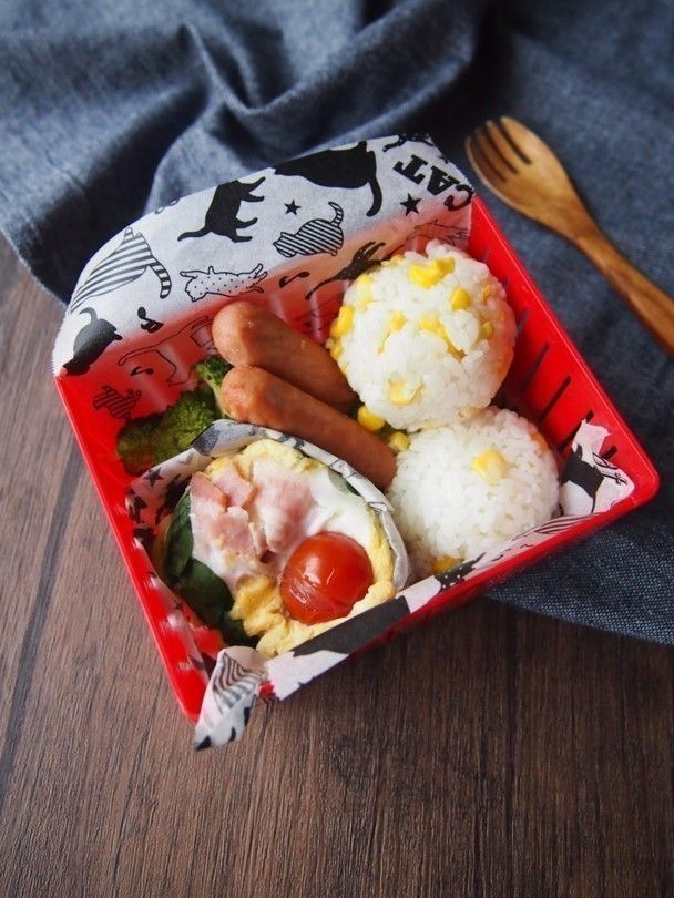 カップに、サラダほうれん草、ベーコン、ミニトマト、卵にパルメザンチーズを混ぜた卵液をいれたもの。それからブロッコリー、ウィンナーを蒸し器に入れたら、レンジで3分加熱。加熱している間におにぎりを握れば、あとはお弁当箱に詰めるだけ。