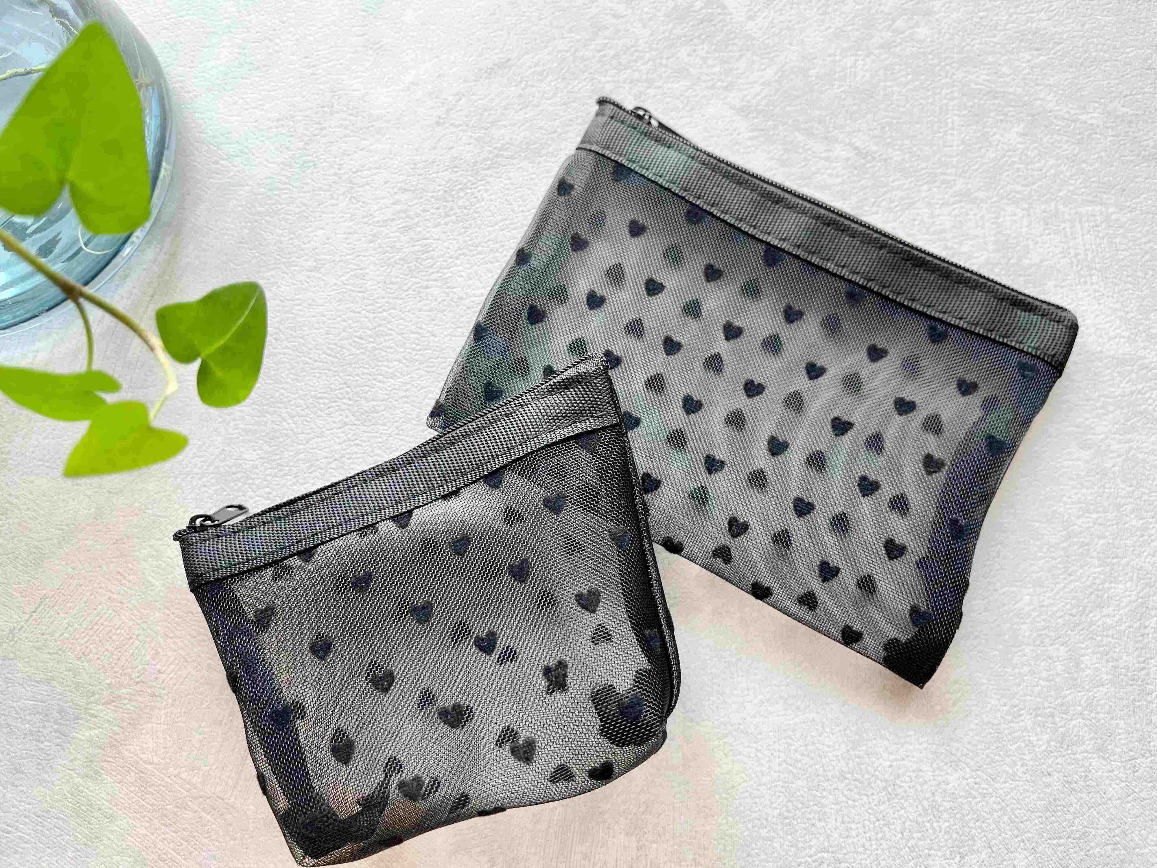 セリアの「シアーハートポーチ」はどちらも使いやすいサイズなので、バッグの中でごちゃごちゃしがちな小物をスッキリ収納するのに便利です。