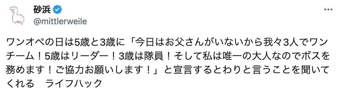 ワンオペ中、息子くんにはリーダー・娘さんには隊員を任命してお手伝いをお願いすると、スムーズにことが進むのだそう!