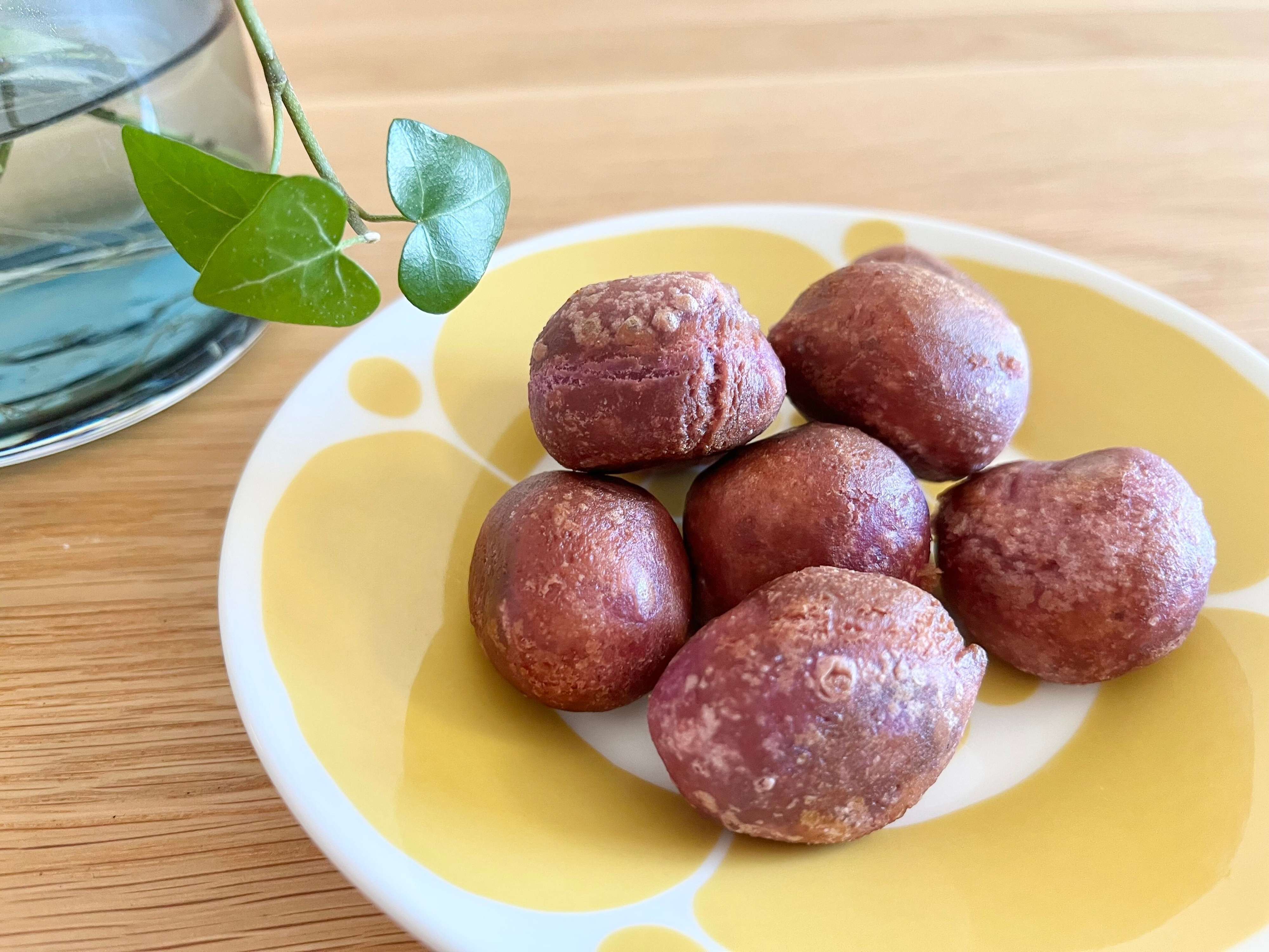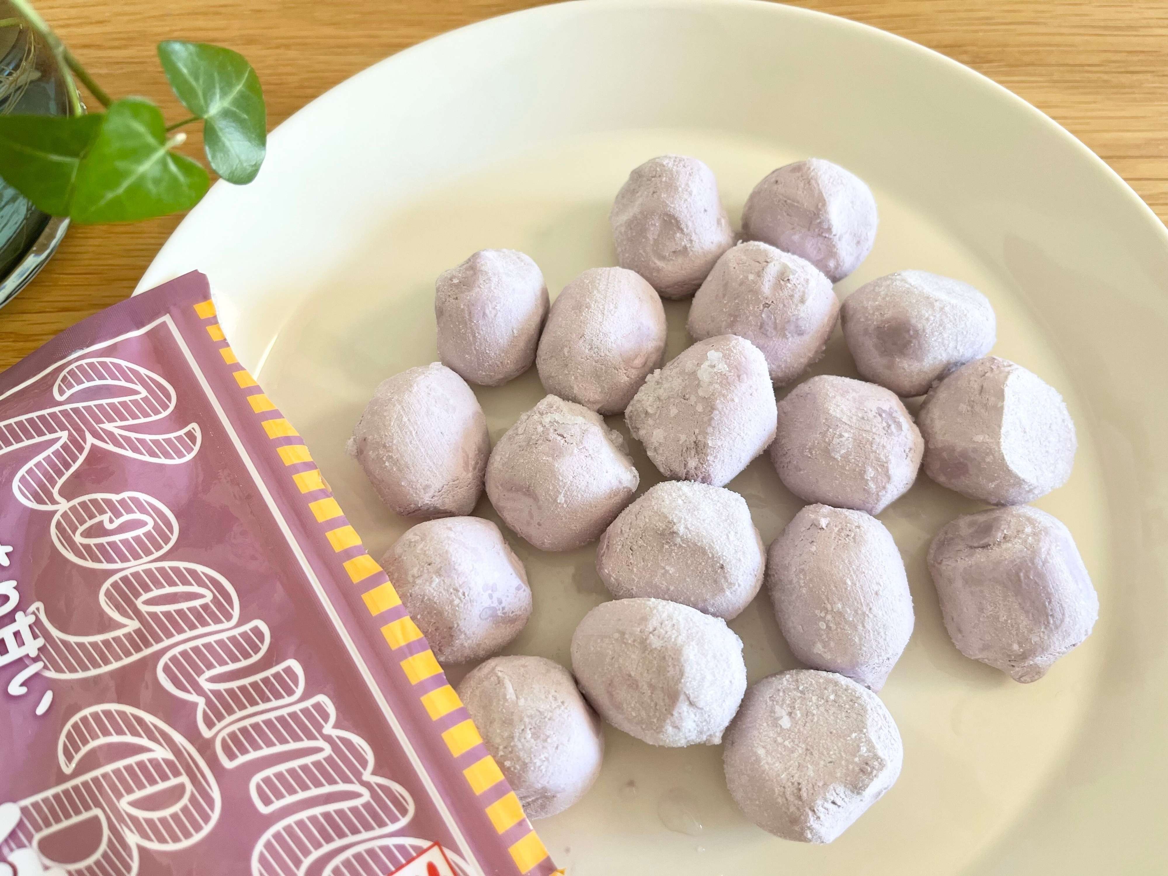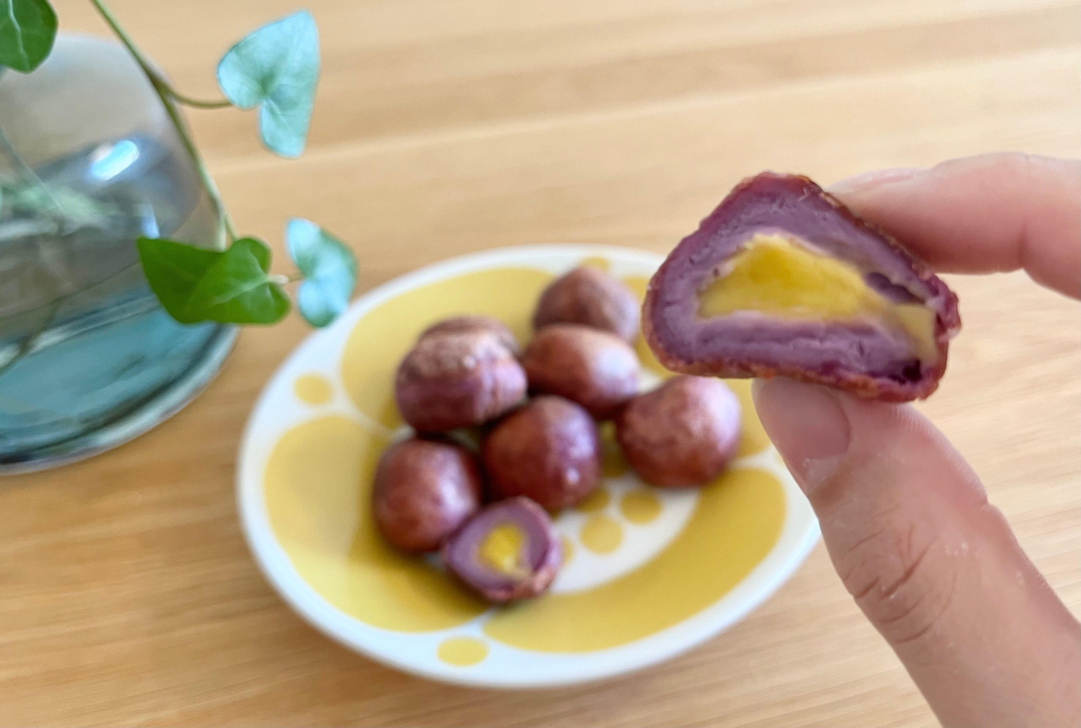 業務スーパーの「さつまいもボール」は、紫芋を練り込んだ生地に、鳴門金時餡を包み込んで作られているんですよ。