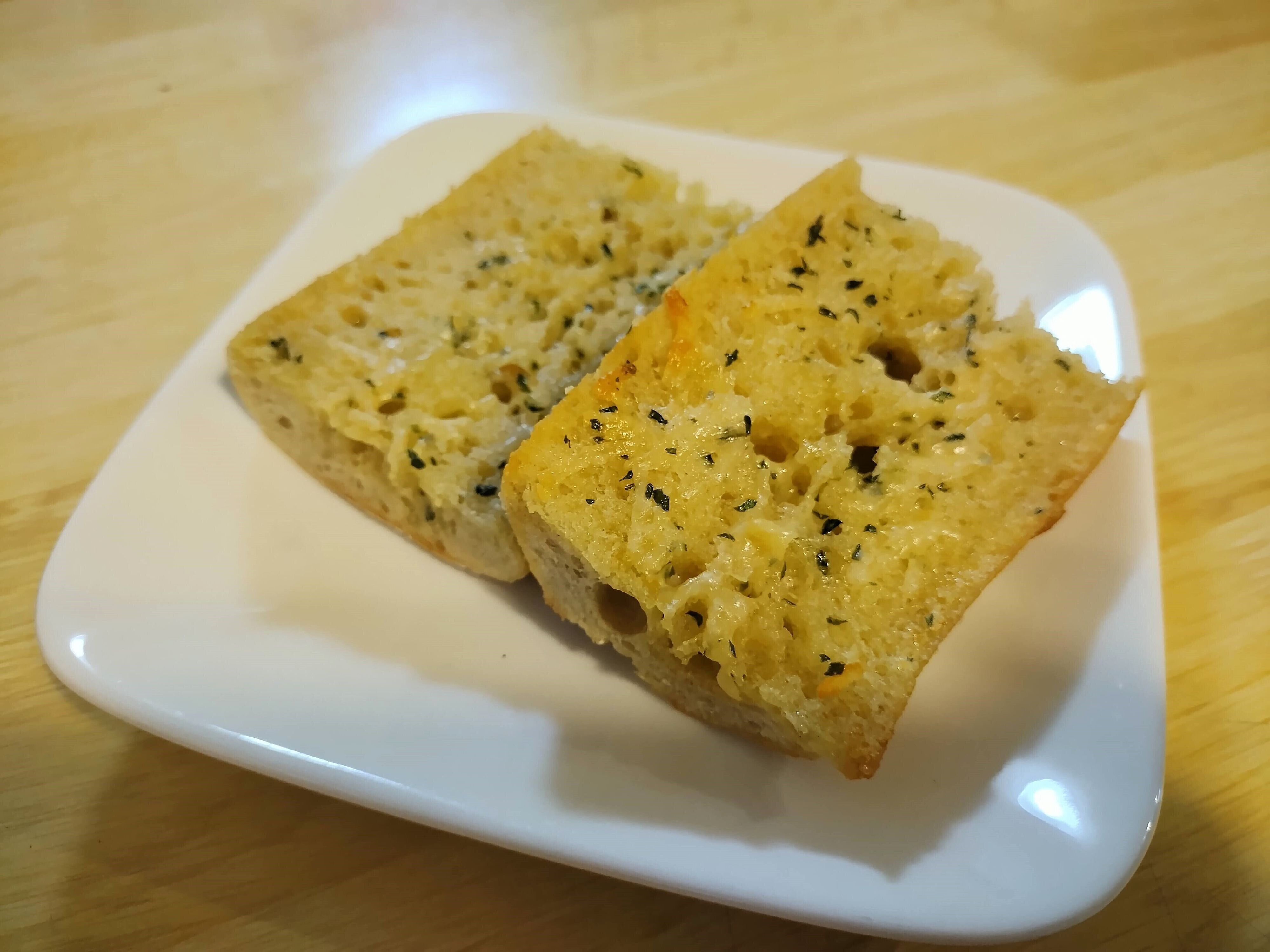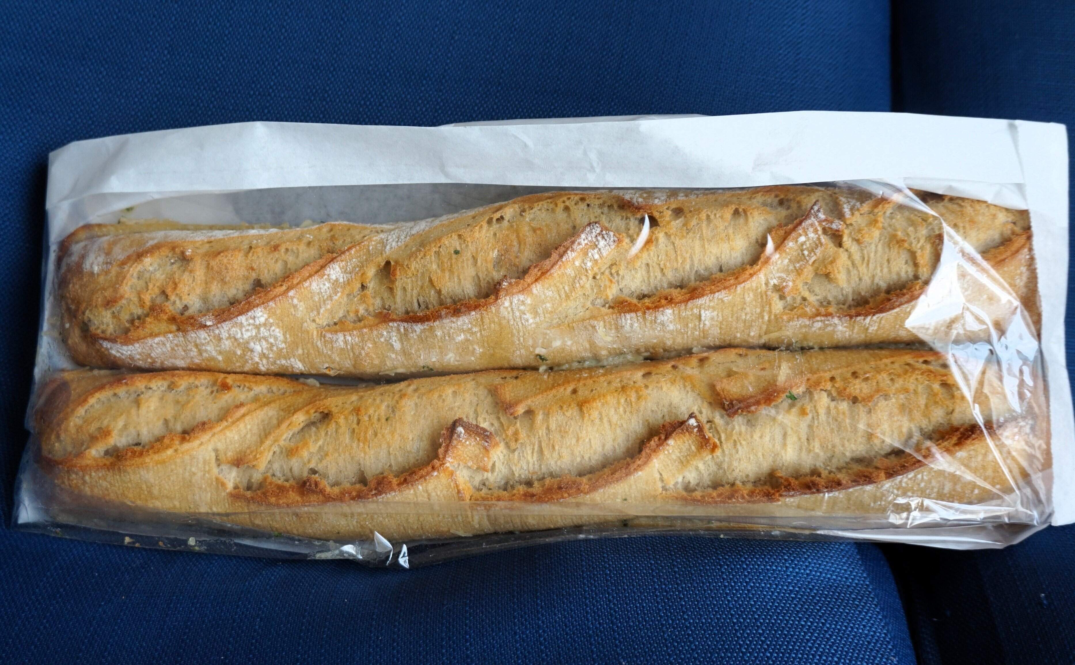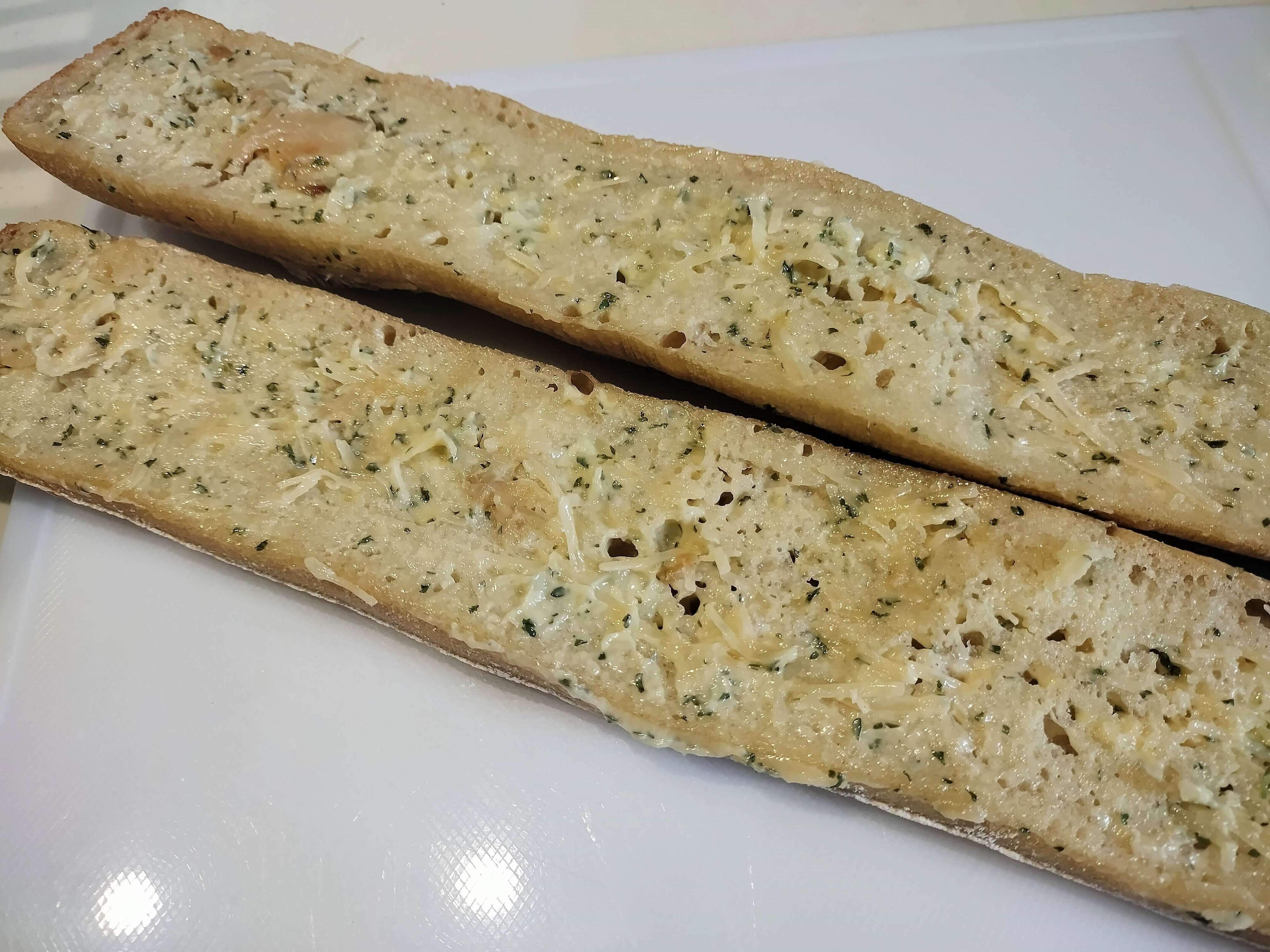ガーリックバターがたっぷり塗ってあるので、焼いてからいただきます。食べ方は200℃のオーブンで9~12分温めていただきます。それ以外には、トースターでパンの表面に焼き色がつくまで温めてもオッケー。