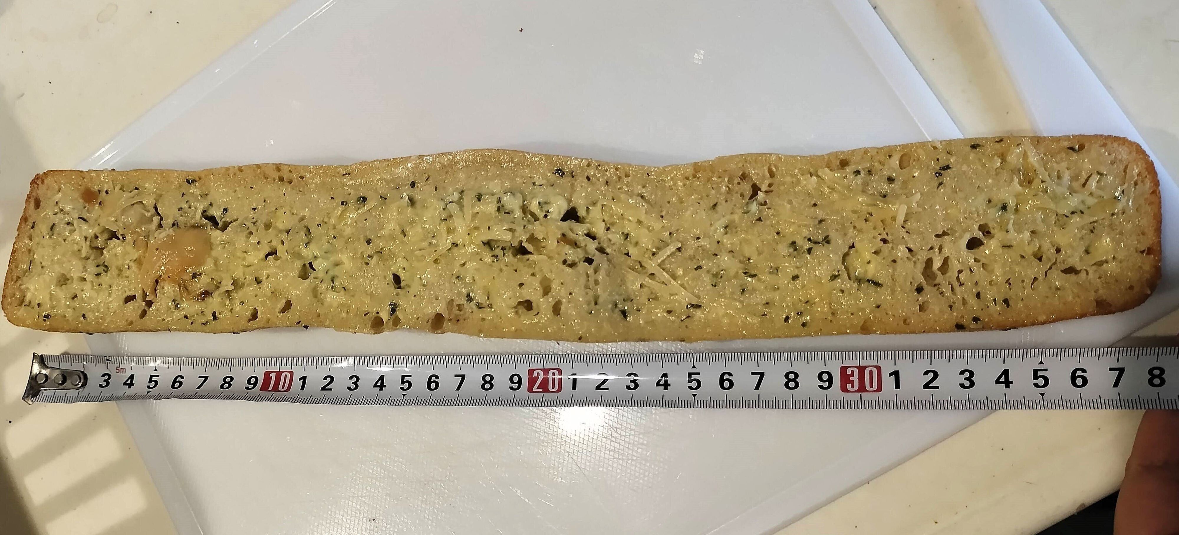 長さを測ってみたところ、筆者が購入したものは38cmでした。コストコらしいビッグサイズです。また筆者が購入した「ガーリックバケット」は、賞味期限は翌日となっていました。余った場合は適当な大きさに切って、ラップに包みジッパーつき保存袋に入れて冷凍しましょう。