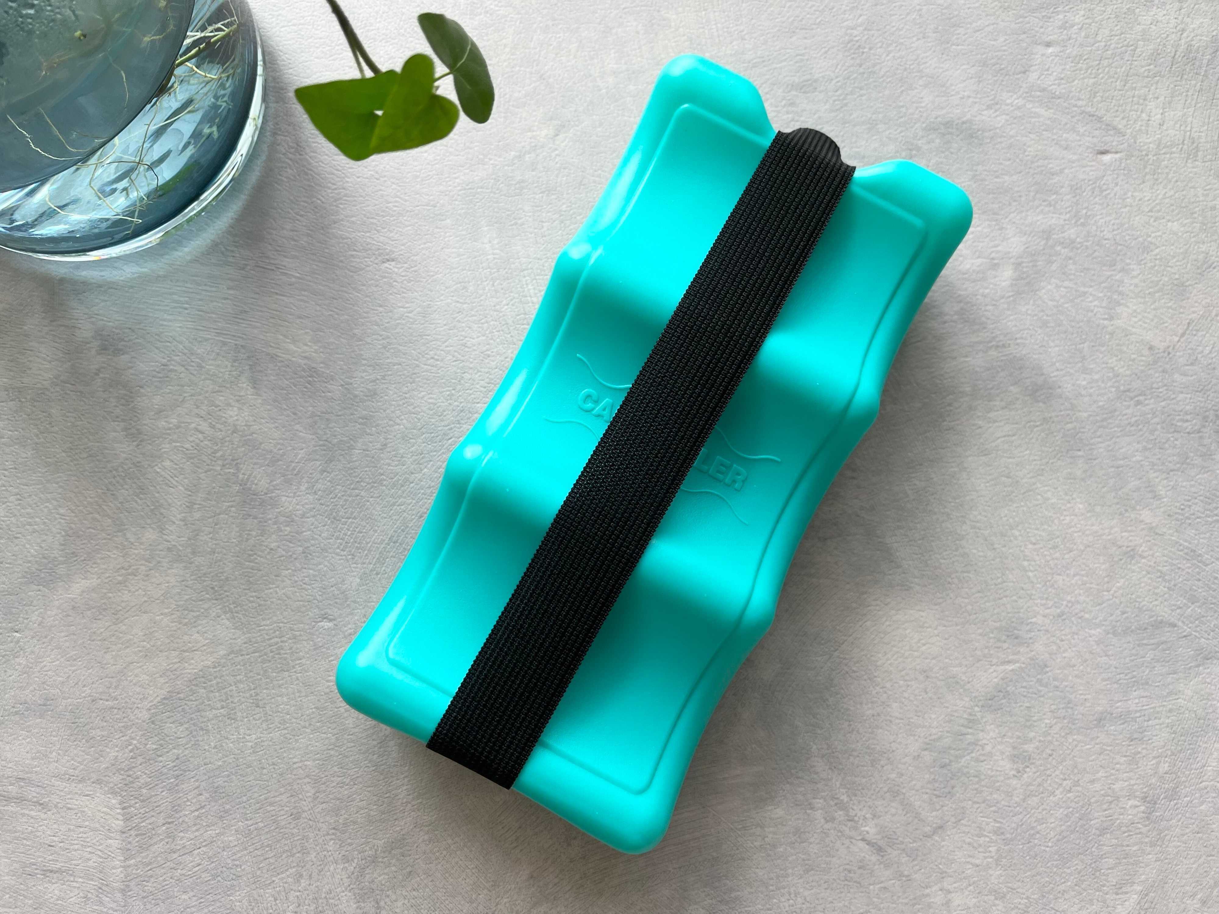 使う時は保冷剤を十分に凍らせてから、保冷剤の窪みに缶のドリンクを沿うように置いて、バンドで固定します。つまり、保冷剤と缶のドリンクをしっかりフィットさせることで冷却させる接触面積を増やし、効率的に缶のドリンクを冷やすという仕組み。