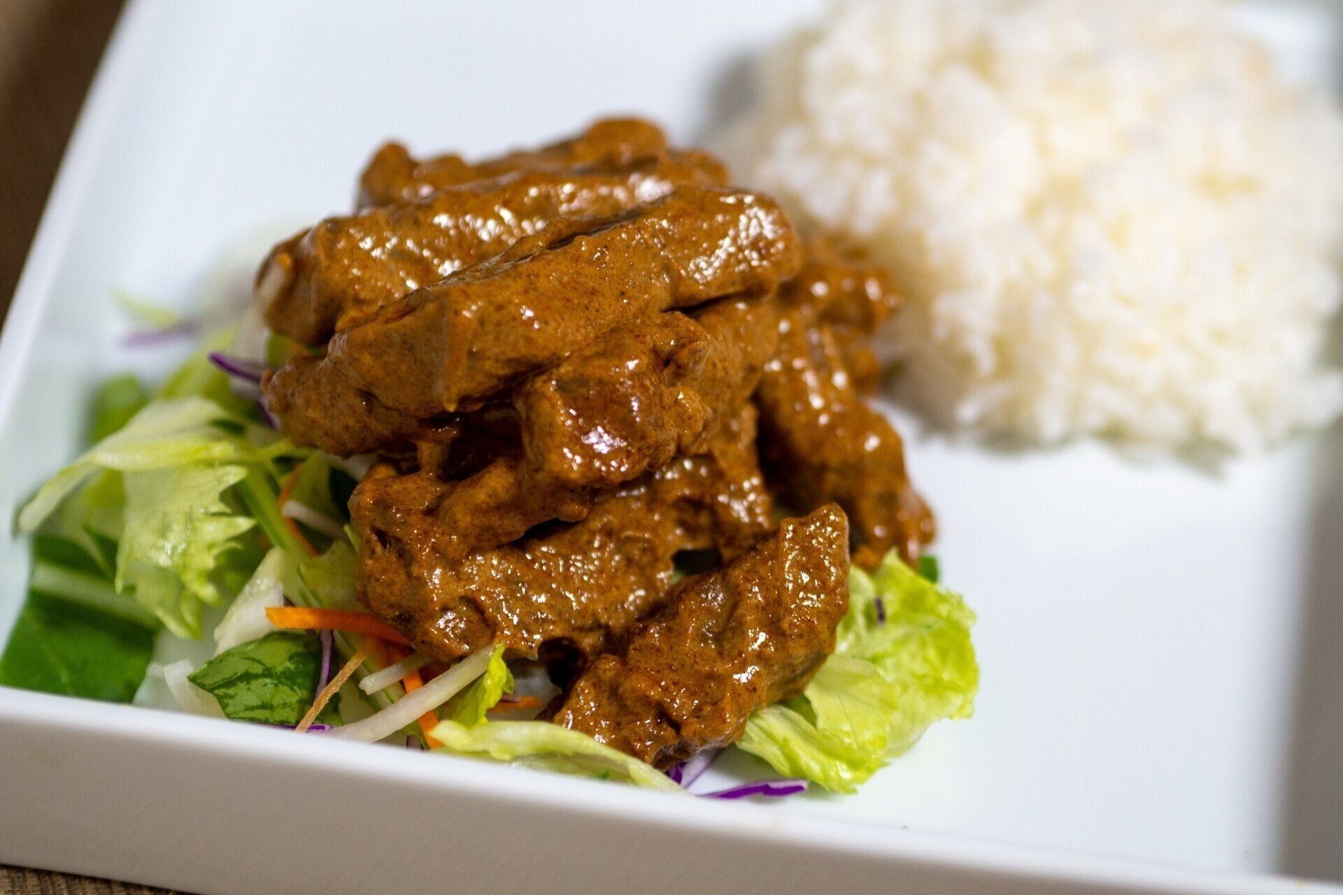 ご飯と一緒に盛り付けていただきます!スパイス全開ですが、まったりココナッツミルクが全体をまとめてくれています。かなり辛いので、辛いものが好きなかたも満足できるかと思います。