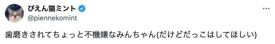 ぴえん猫ミントさん(@piennekomint)の投稿が話題になっています。投稿したのは、歯磨きをされて不機嫌になった愛猫ミントちゃんの動画。怒りつつも、ぴえん顔で飼い主さんに甘える様子に、「かわいすぎる」といった声が寄せられました。