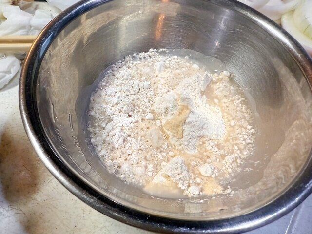 オニオンリングの素をボウルにいれ、水を加えてよく混ぜ衣を作っていきます。