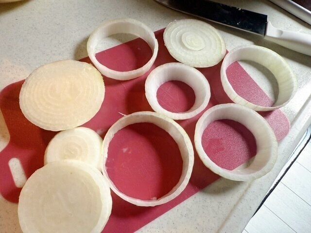 玉ねぎは皮をむいて、輪切りにしばらしておきます。