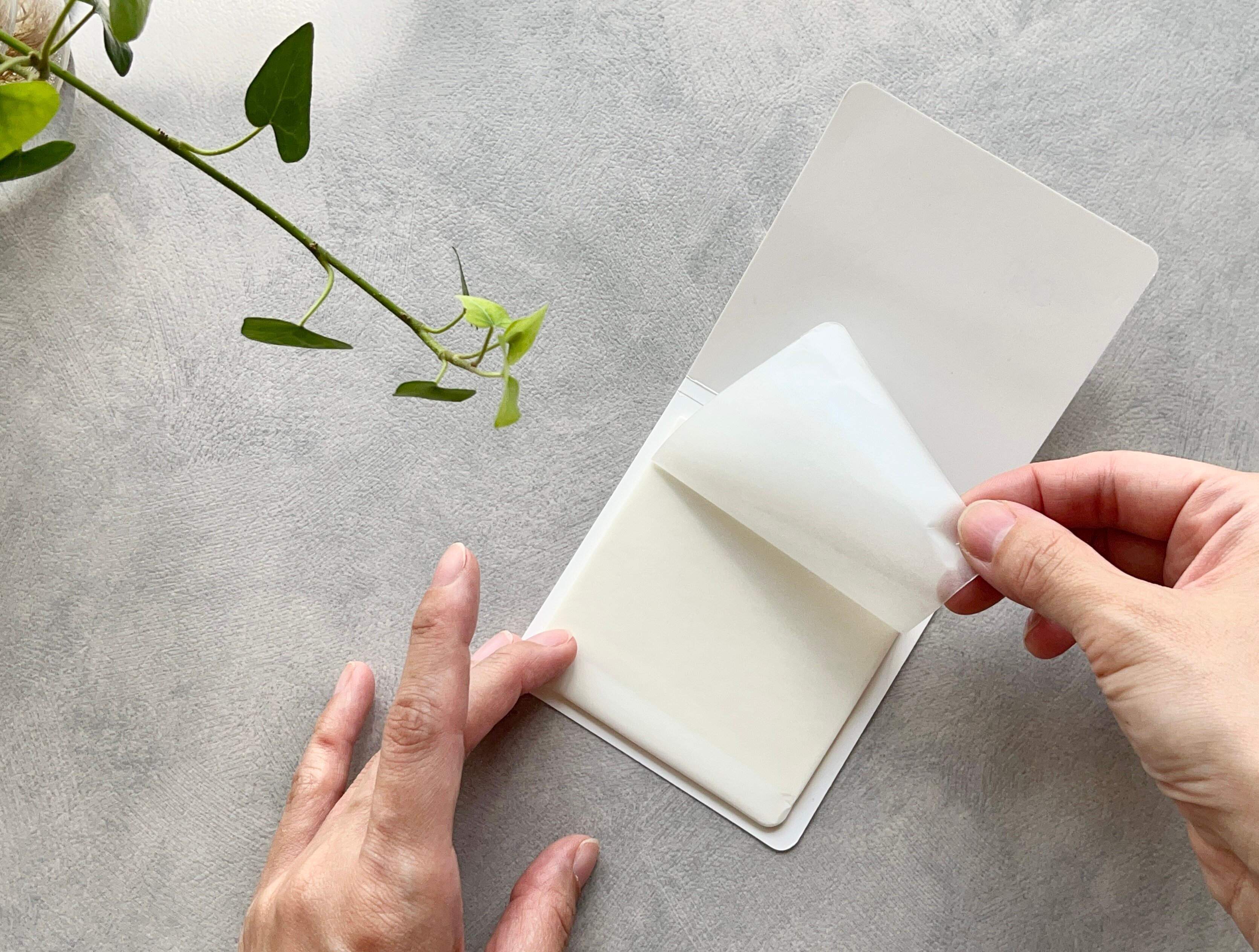 こちらの商品の最大の魅力は、やはりこのコンパクトさ!まるで、あぶらとり紙のような感覚で、メイク道具などと一緒にポーチに入れて持ち運んだり、コートやスーツのポケットにだって、入れることができます。薄手で邪魔にならないので、いつもバッグに忍ばせておけば、気づいた時に手軽に使えるのでとっても便利ですよ。
