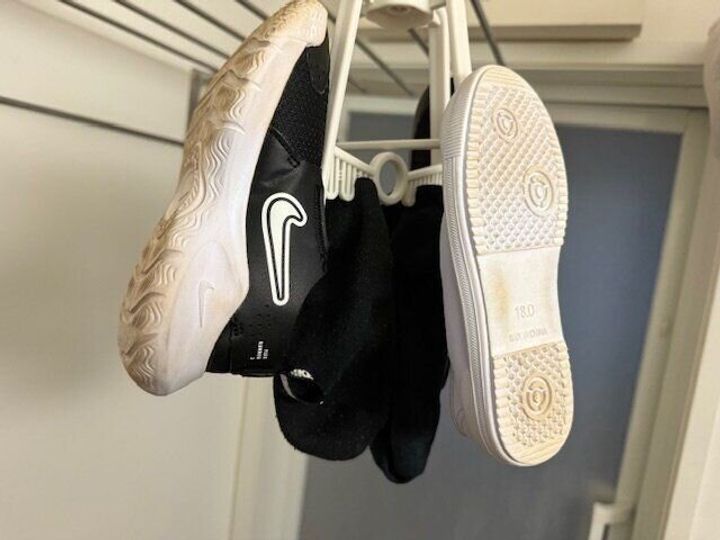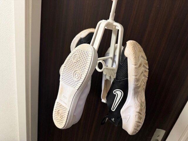 早速洗った靴を引っかけてみると…。靴と靴同士もぶつかることはなく、しっかり干せます。
