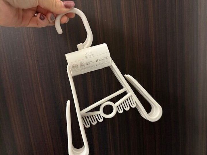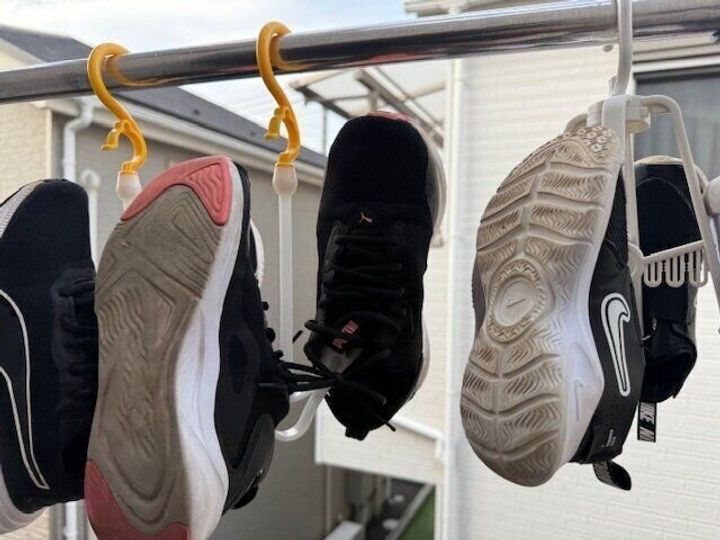 でも、この「多機能シューズハンガー」なら、これまでの半分の数で靴が干せるようになりました。