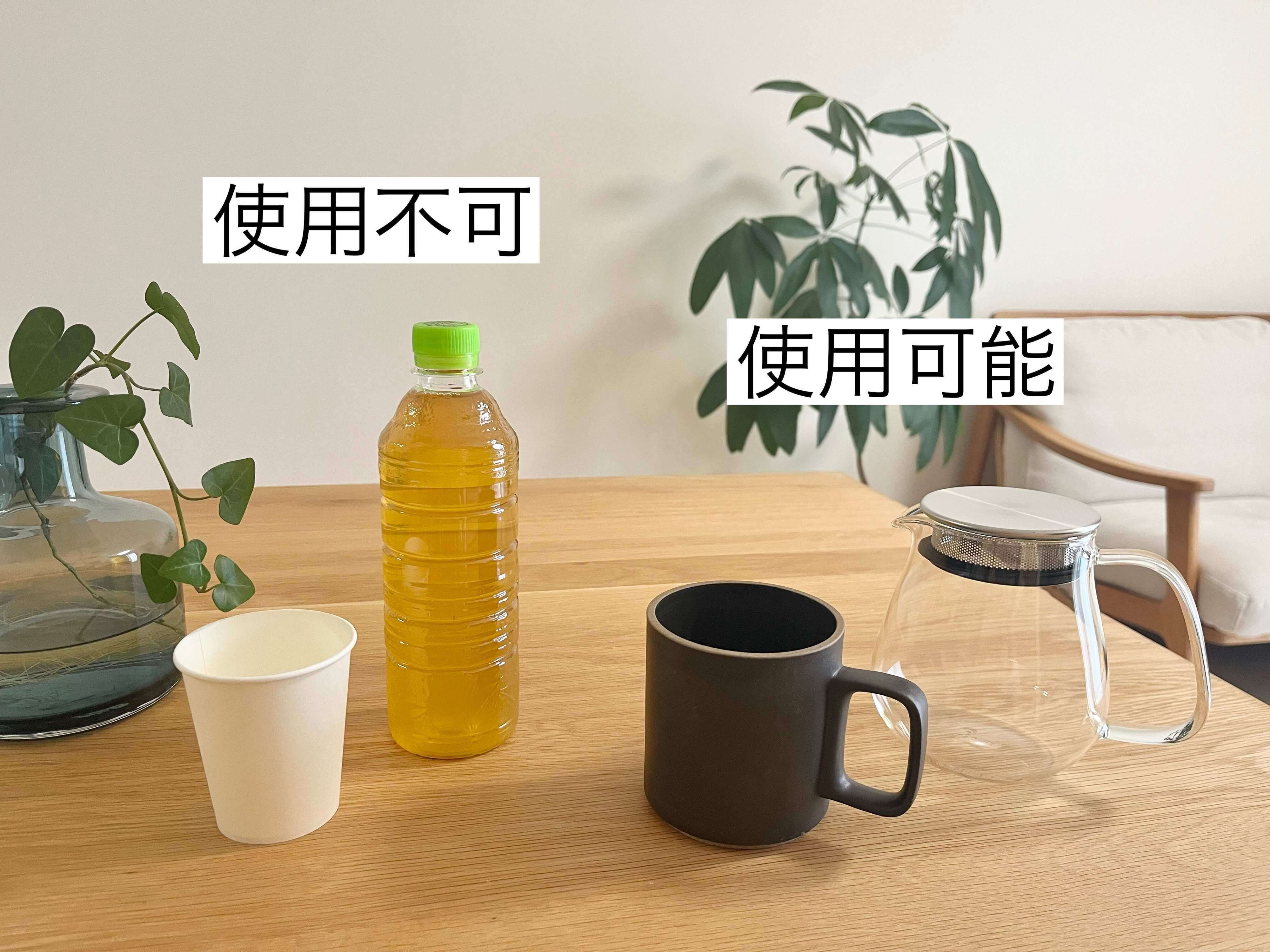 あとは素材ですが、耐熱ガラス製や金属製や陶磁器製のカップが使用でき、紙製や木製のカップ、あとはペットボトルも使用不可です。また、カップだけでなく、底面のサイズがプレートに合えば耐熱ガラス製の紅茶のポットなども使用ができますよ。