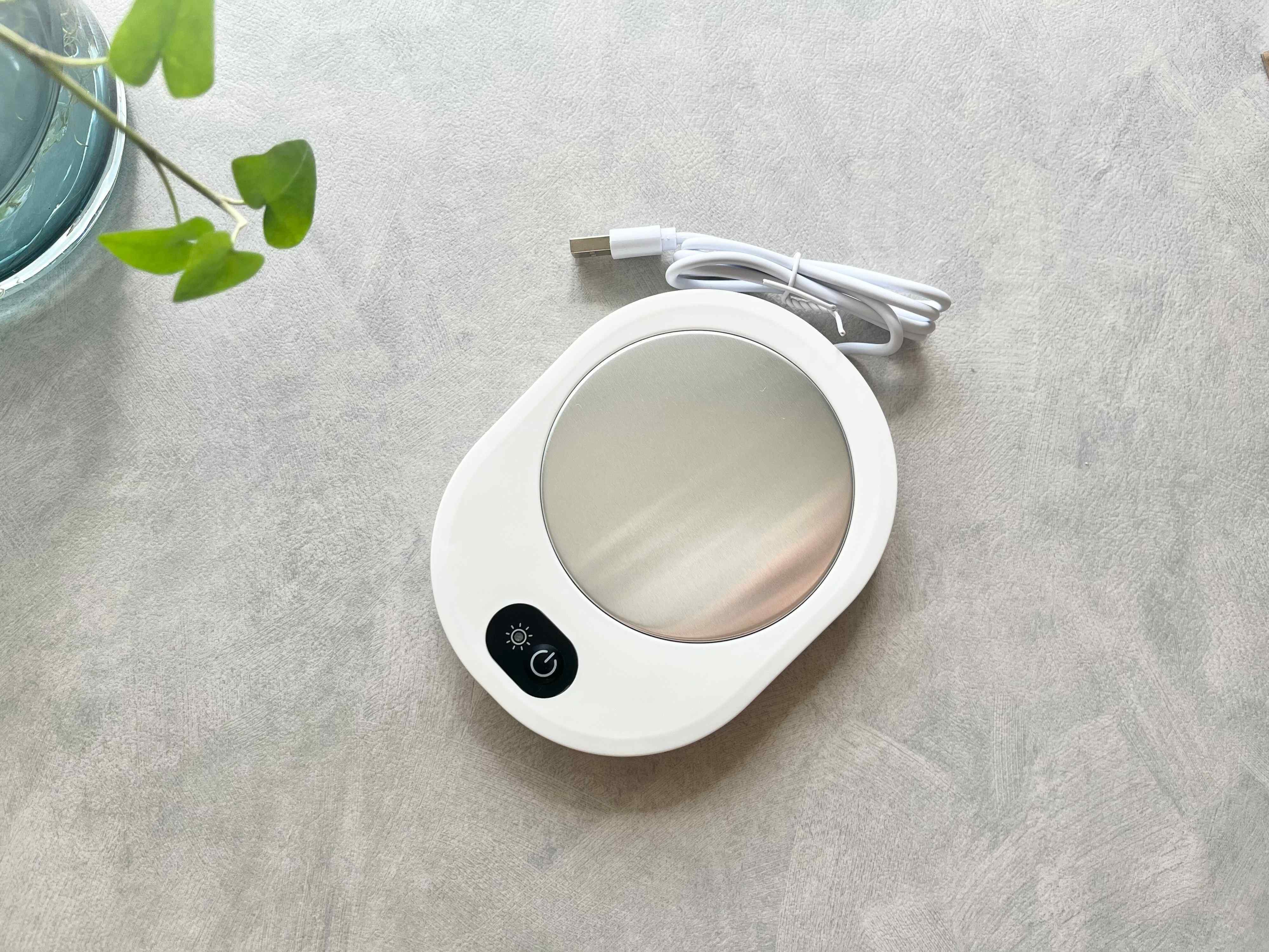 使い方は、ホットドリンクを入れたカップをシルバーのプレートの中央に置き、手前の電源ボタンを押すだけ!電源を押すと隣のランプが赤く光るようになっているので、電源のON・OFFは一目瞭然です。