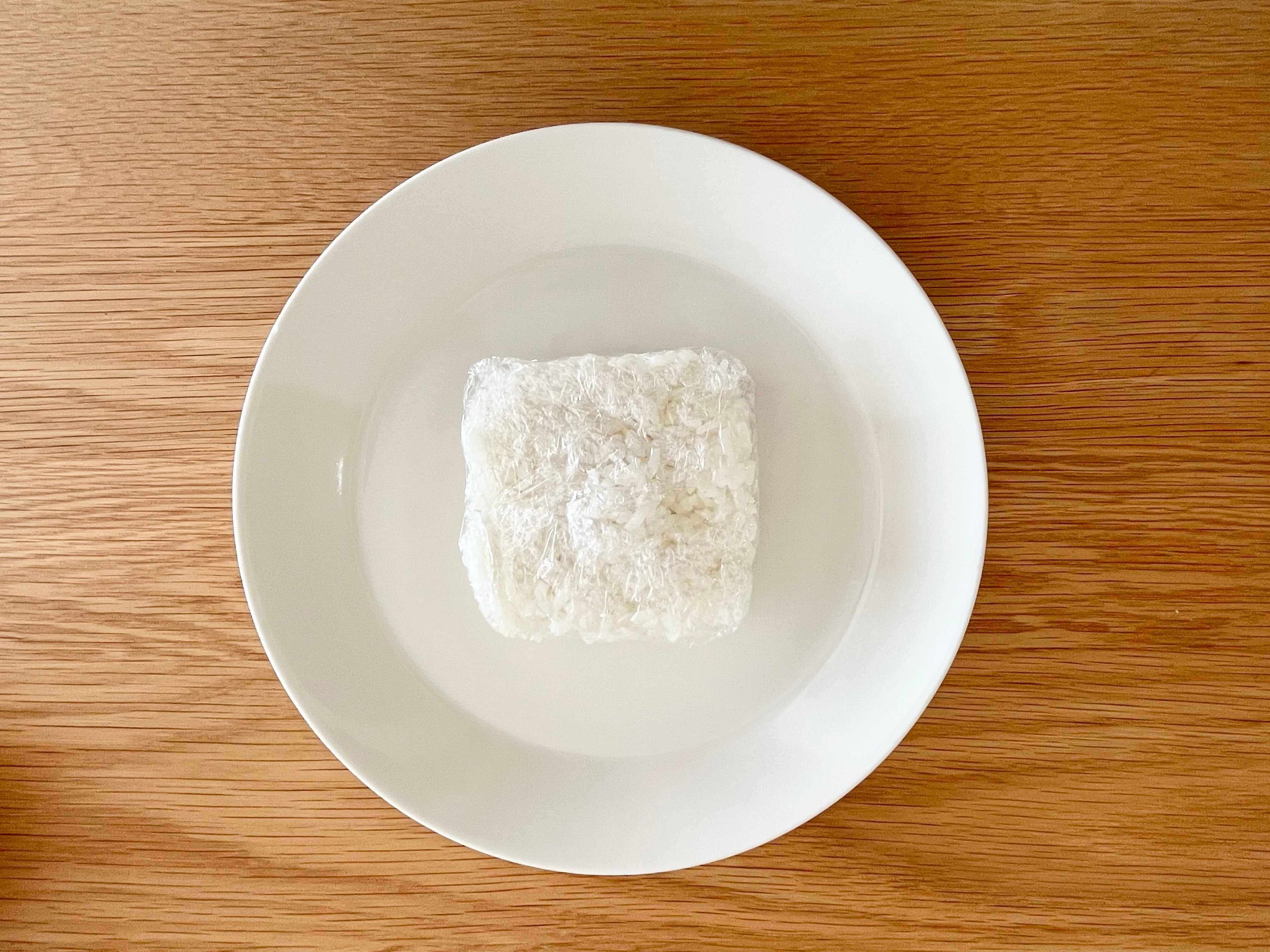 最後にラップで包んで押し具で抑えたら完成!たったコレだけでキレイな四角い形で約100gのご飯をラップで包むことができます。