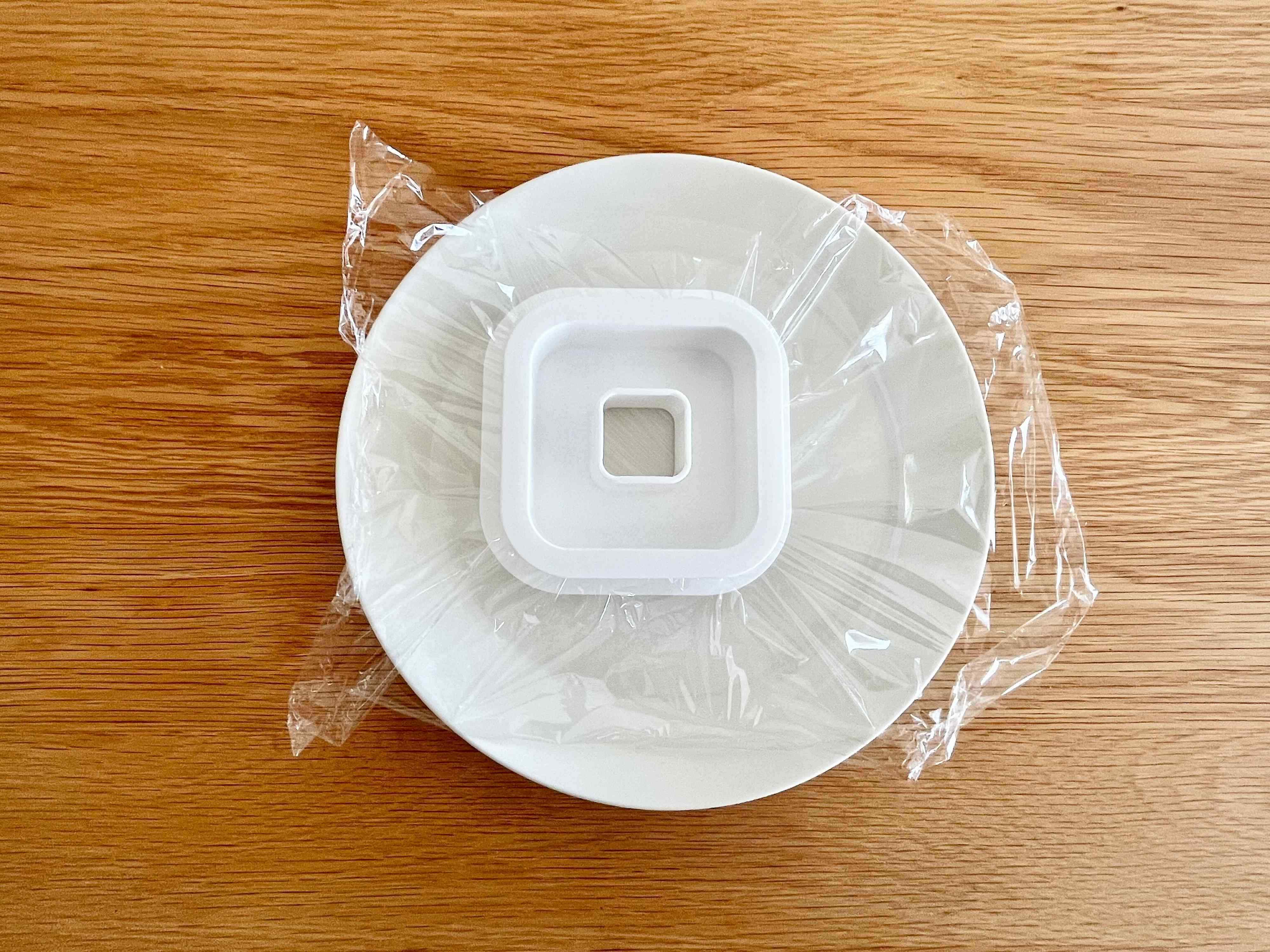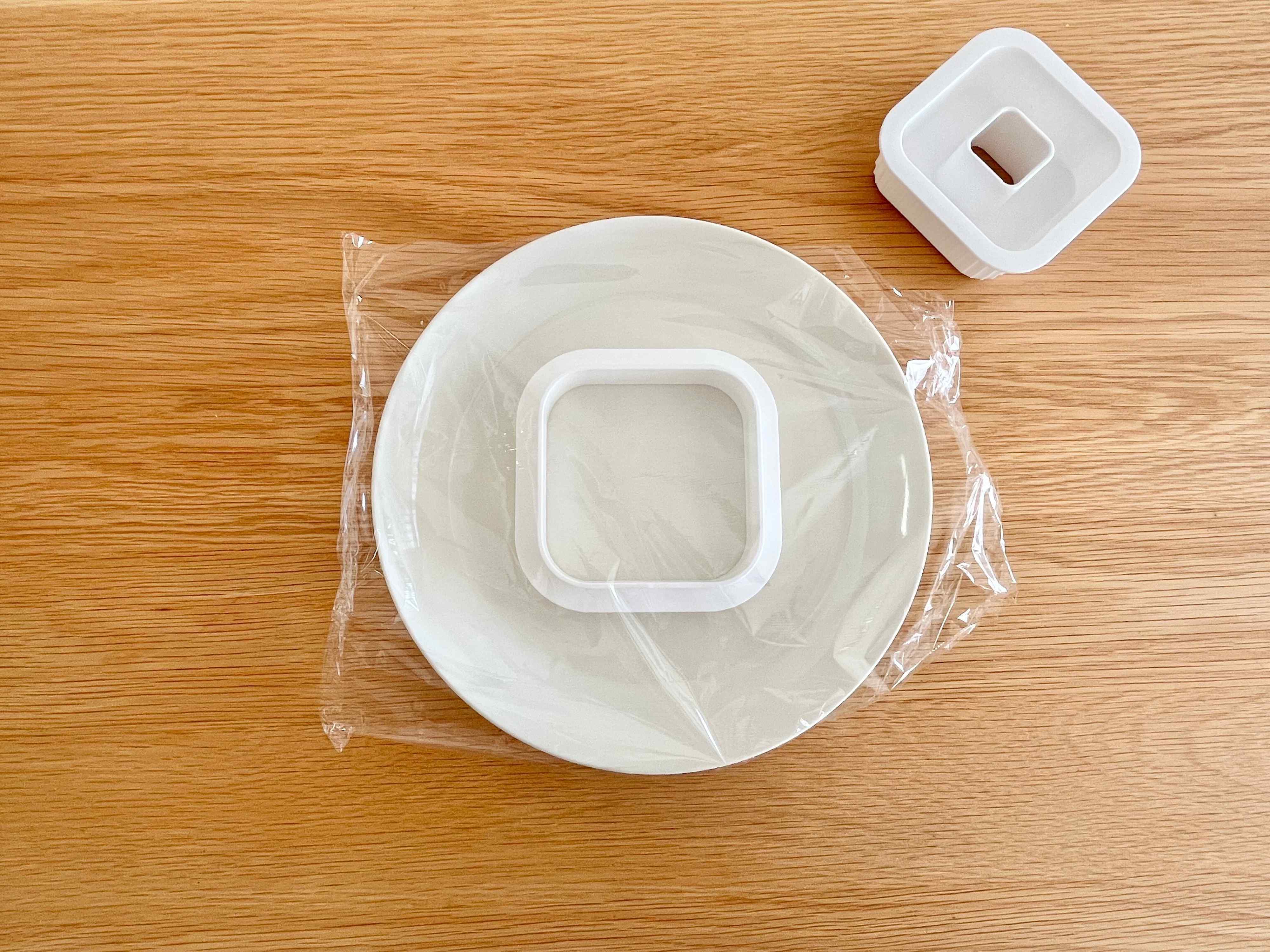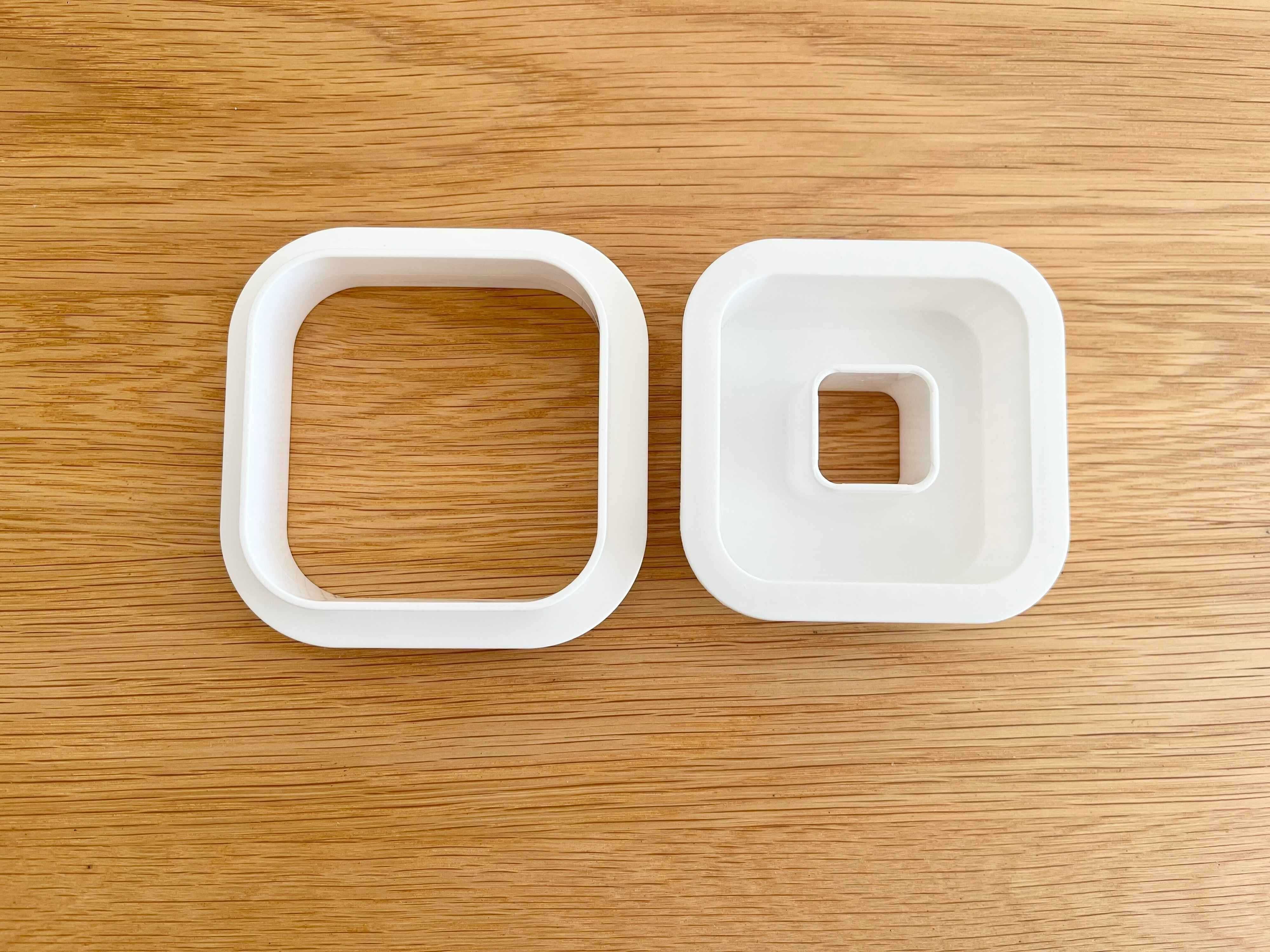 商品のサイズは、約104mm×104mm×30mm。真ん中に穴が空いた四角いドーナツのような型をしているのが特徴です。