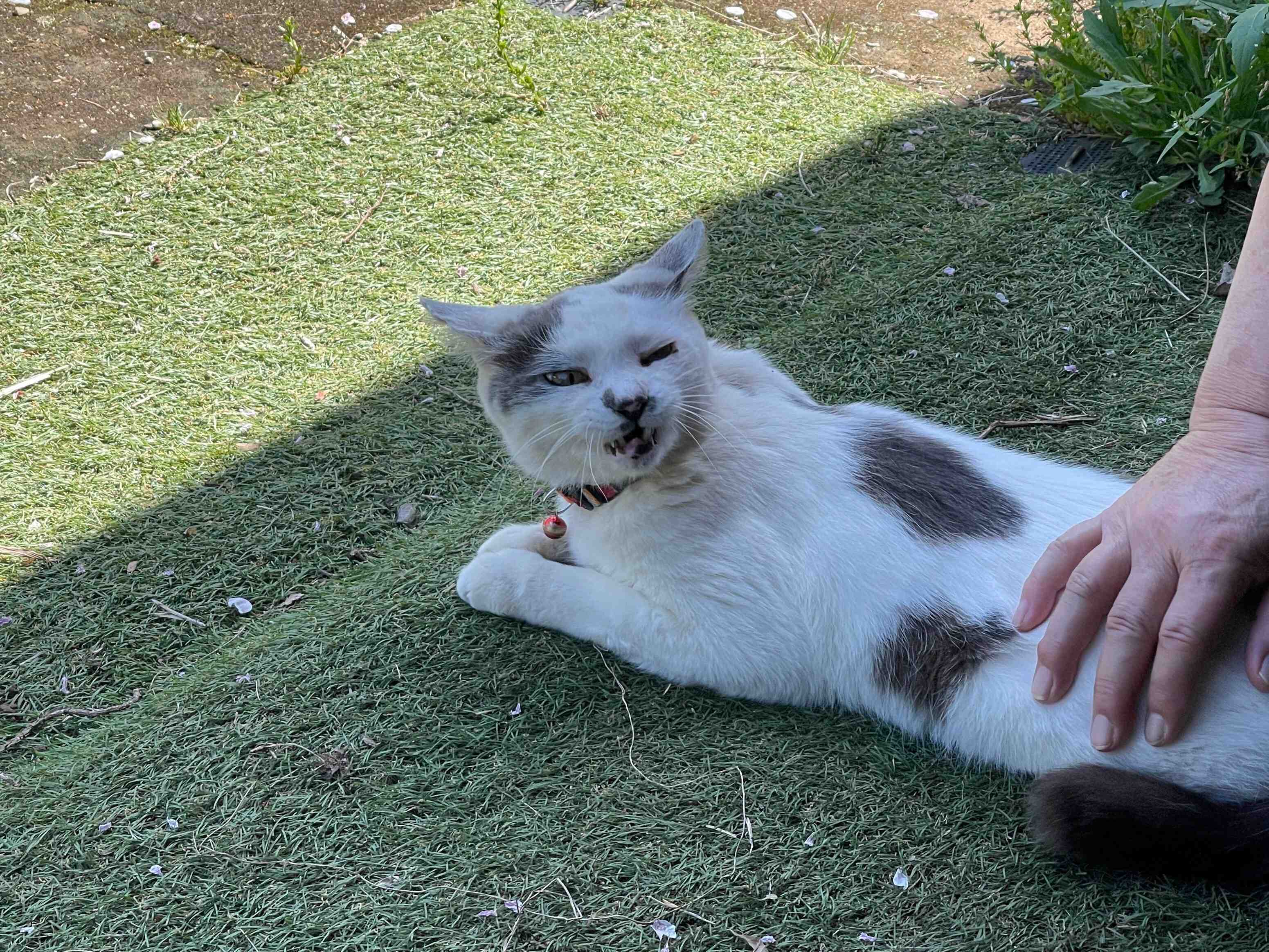 「ポン酢が玄関前で休んでいたときに、私と母が玄関横のイスに座って撮影したものです。私がポン酢の写真を撮ろうと近づいたと同時に、母がポン酢をなでたため、ポン酢が私だと勘違いをして『なんだ!?』と振り向いて、このような表情になりました」