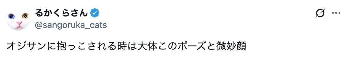 るかくらさんさん(@sangoruka_cats)の投稿に注目が集まっています。投稿したのは、愛猫くららちゃんがオジサンに抱っこされている写真。ジト目で必死に抵抗するくららちゃんに、13万いいねと「正直ですなwww」の声が集まりました。