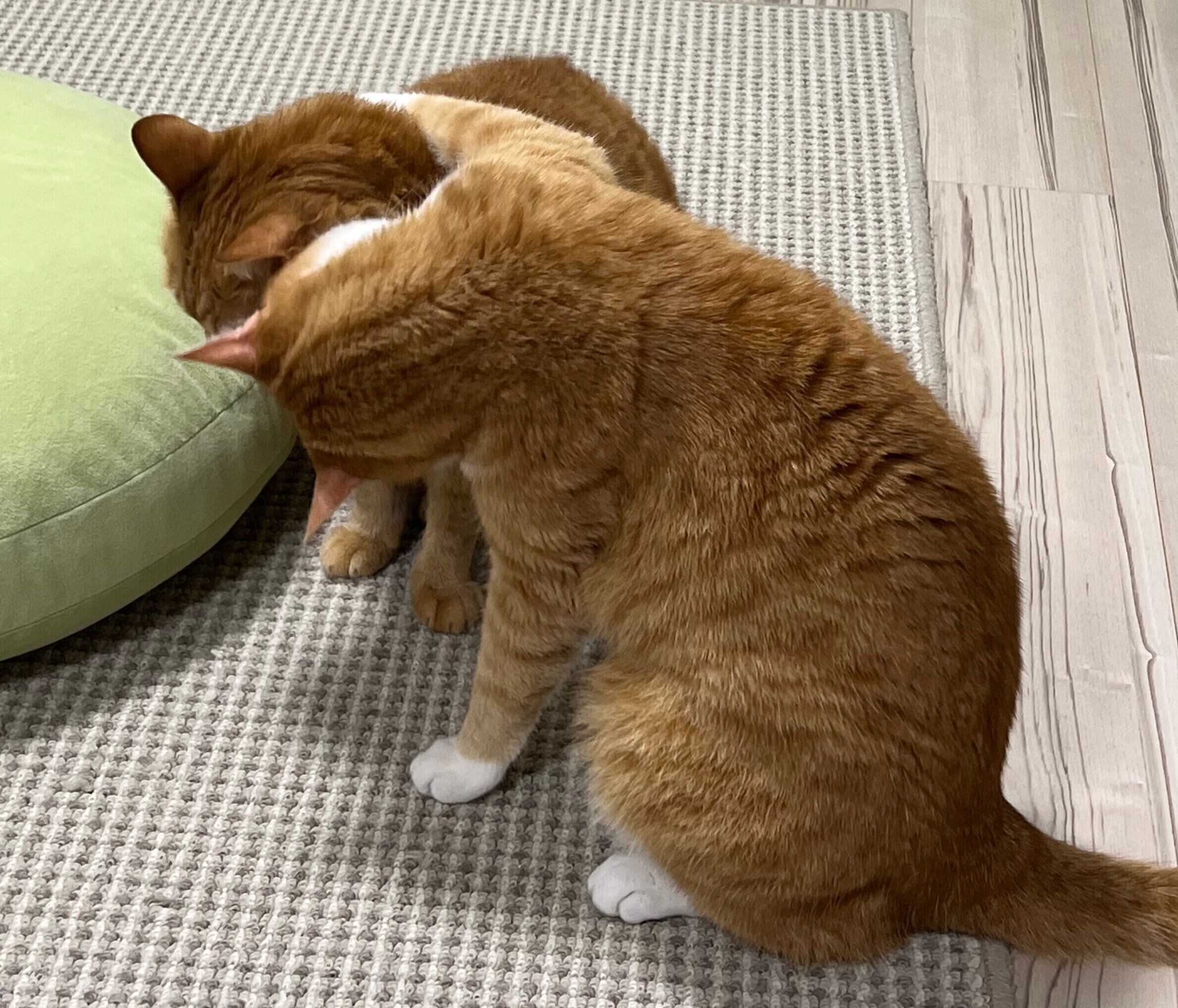 「クウちゃんは自由で、主張もしっかりする甘え上手なタイプ、カイちゃんはちょっとビビりで、甘えたくても一歩引いて遠慮するタイプです。よき遊び相手であり、どちらもそれぞれのことを気にかけてはいるようです」