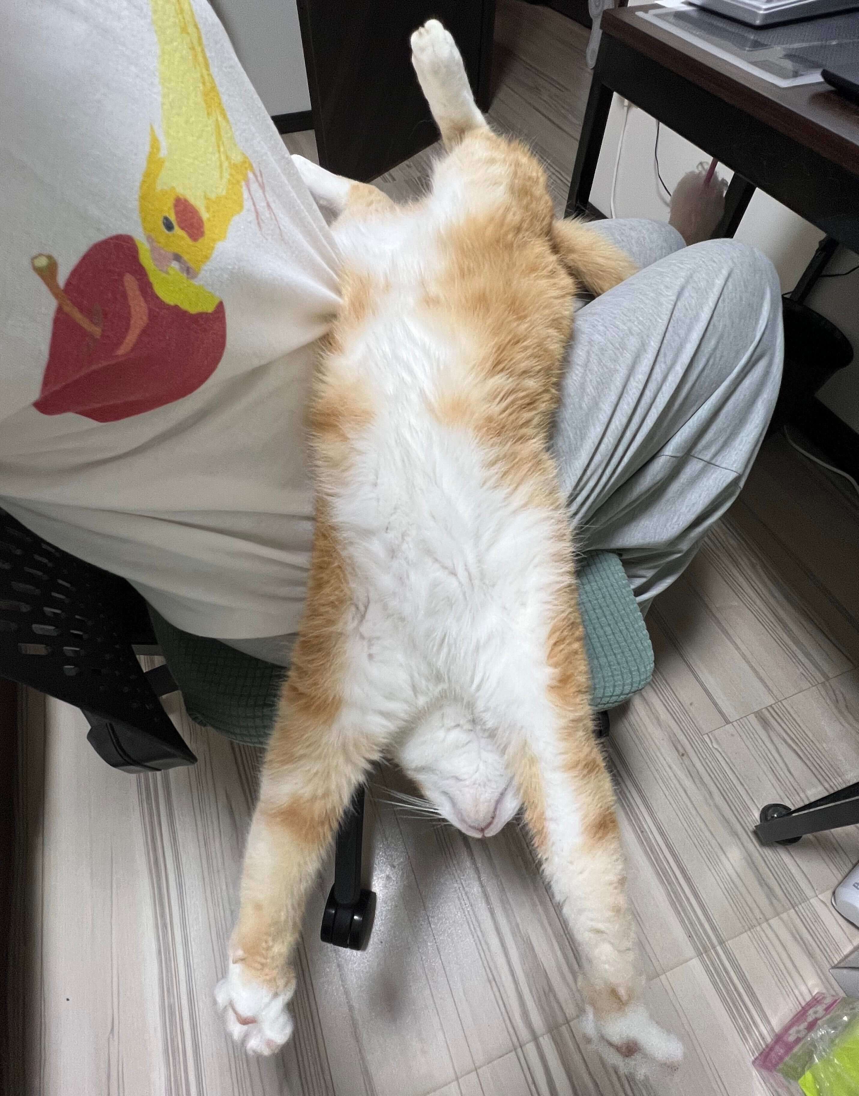 「仕事の区切りがついたところに、クウちゃんが甘えにやってきたので仕事を終え、床に転がるクウちゃんを抱き上げてなでていたところ、どんどん伸びていきました」