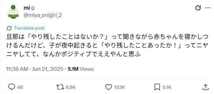 miさん(@miya_onigiri_2)が投稿したのは、子育て中のエピソードです。miさんの夫はポジティブ思考だそうで、息子を寝かしつけるときや、夜起きてしまったときの声掛けが前向きなのだそう。「素敵」のコメントを集めた投稿に注目です。