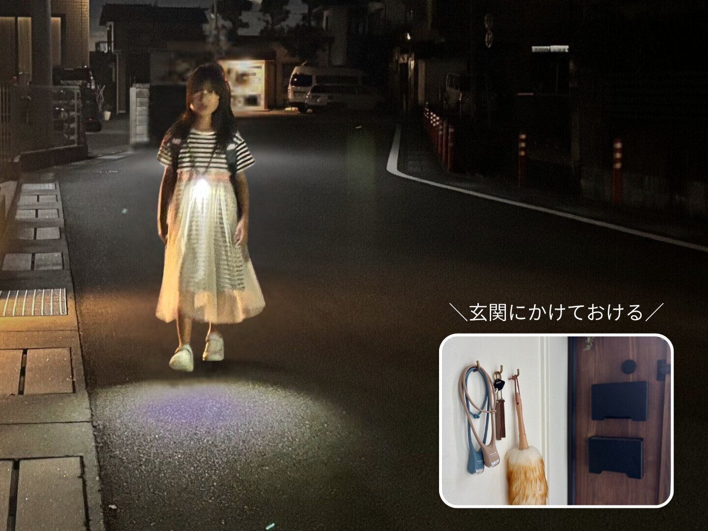 「だんだん日が落ちるのが早くなって、子どもの習い事の帰り道が心配だなぁと思っていたら、この小さな『LED ネックライト®』がめちゃくちゃ大活躍! 軽 くて玄関にかけておける手軽さだから夕方のお出かけ前にサッと手に取っていけます」(サンキュ!アンバサダーひろかさん※以下ひろかさん)
