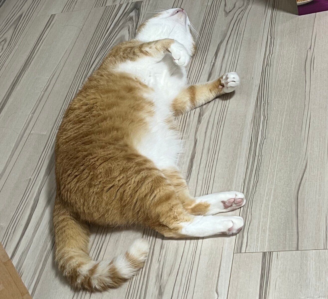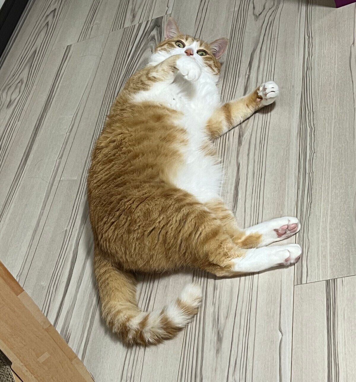 「夕飯をとっていたとき、先にごはんを食べ終えて寝室で休んでいたクウちゃんが、リビングへやってきて転がったときに撮ったものです」
