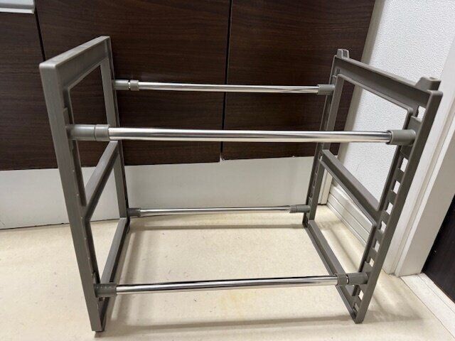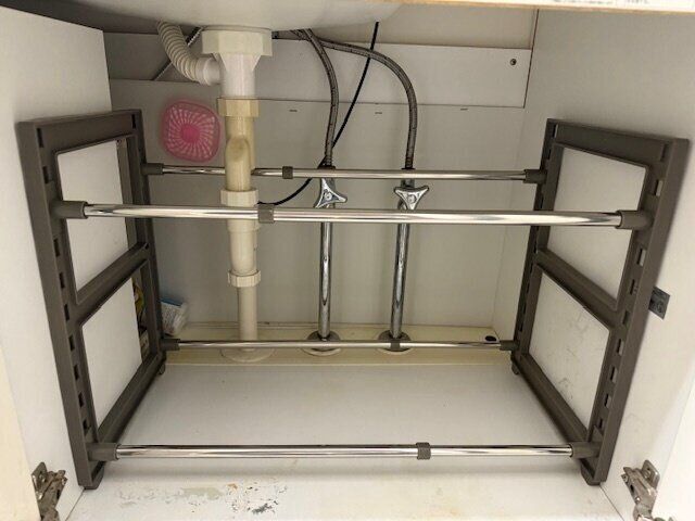 この【伸縮シンク下収納棚】は幅も高さも調整できるので、配管をよけながらしっかり設置できました