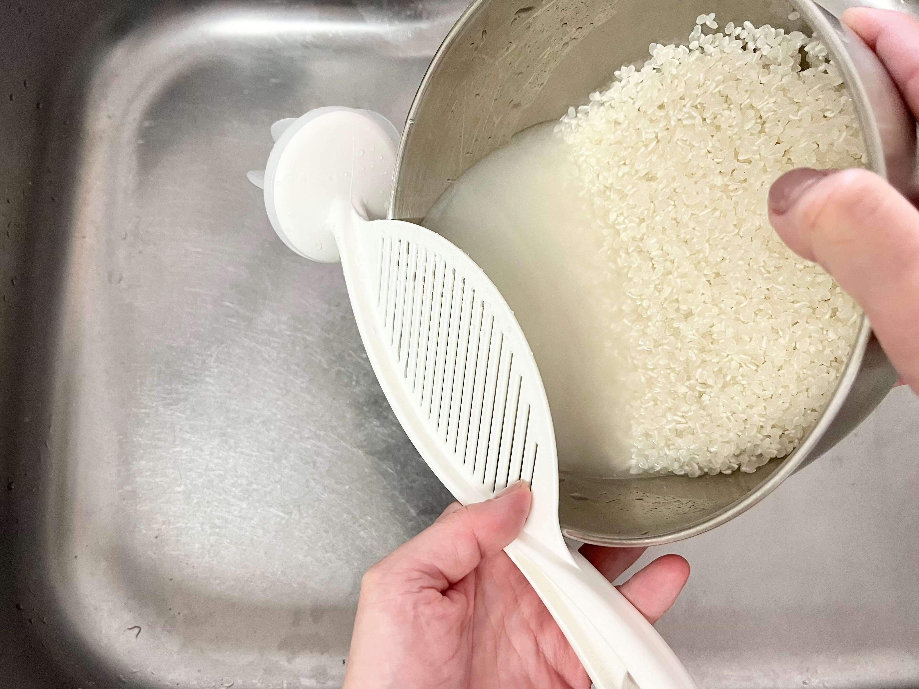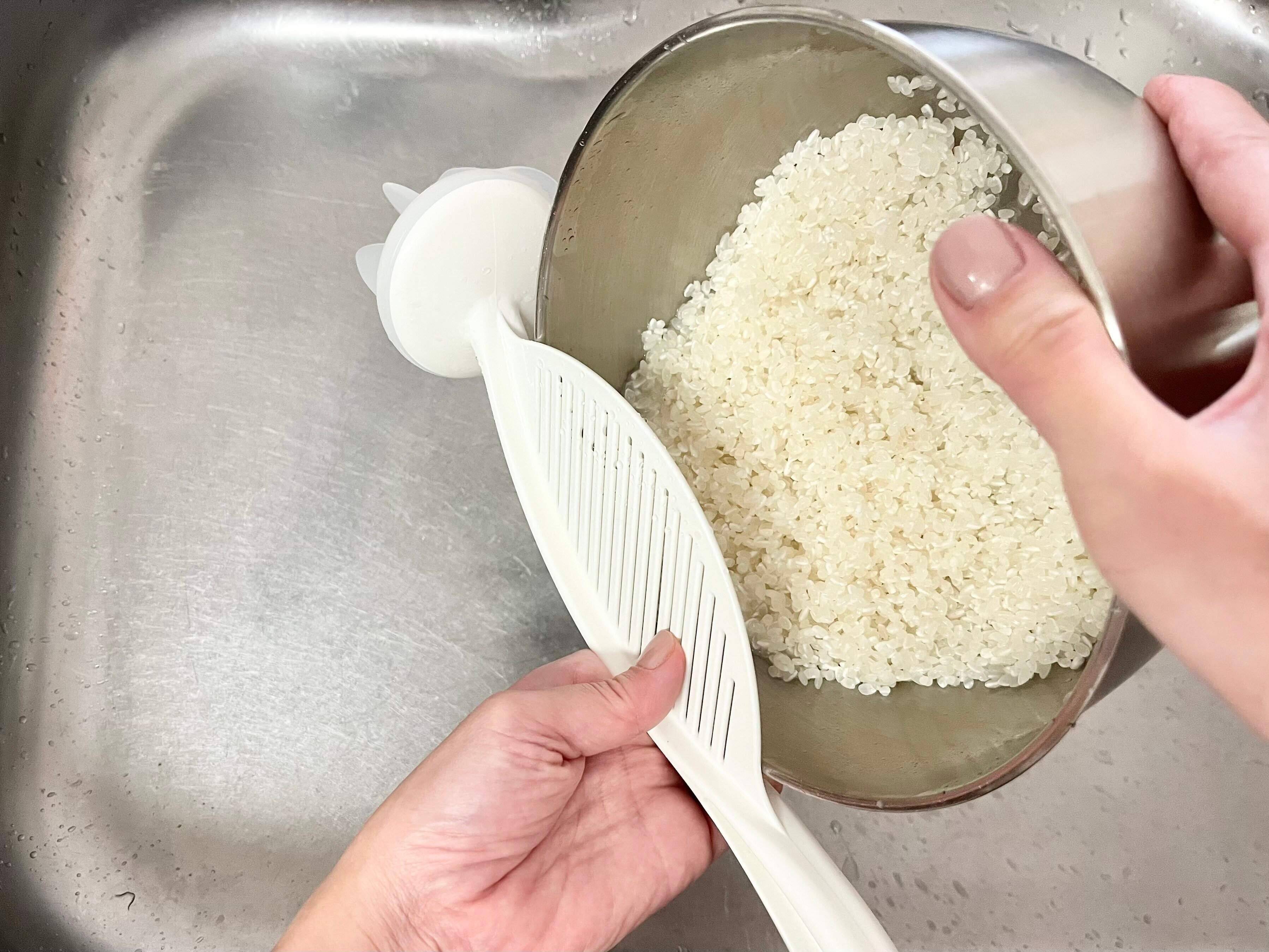 最後に、すすぎと水切りを繰り返し、水がほぼ透明になったらお米とぎは完了です。お米をとぐ丸いパーツは柔らかい素材でできているので、お米に傷が付きにくいのも好印象!それに、水切り板のカーブがボウルのフチにフィットするように作られているから、お米が流れ出ずに最後までしっかり水を切ることができました。
